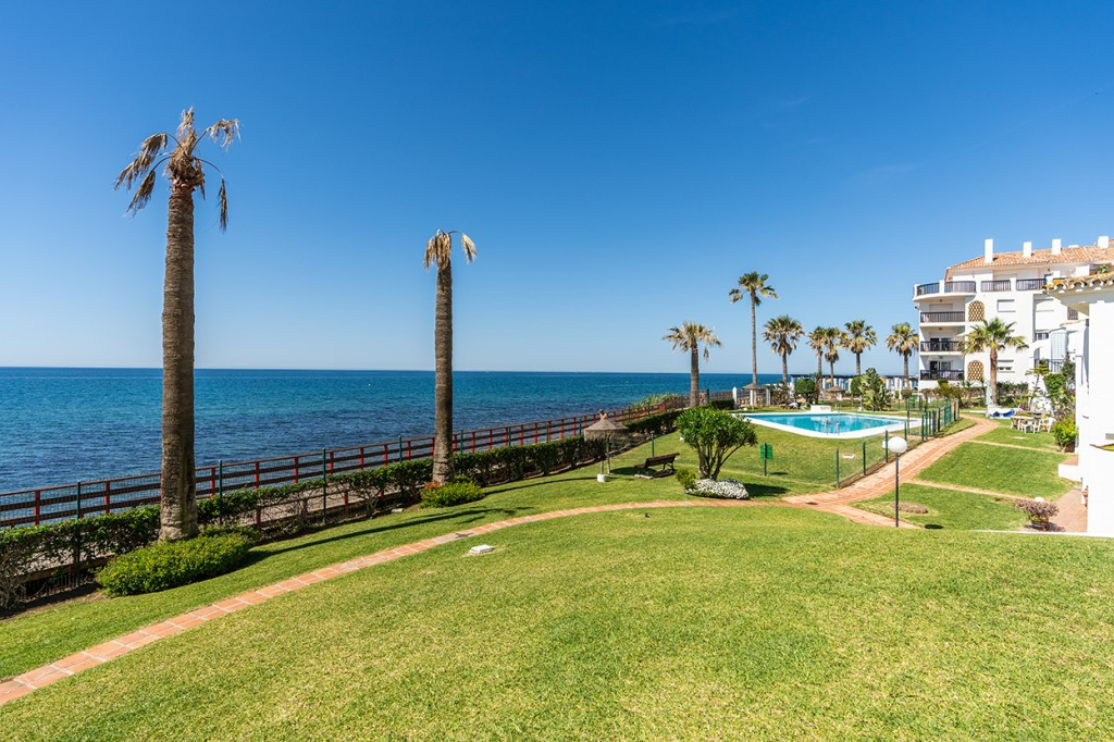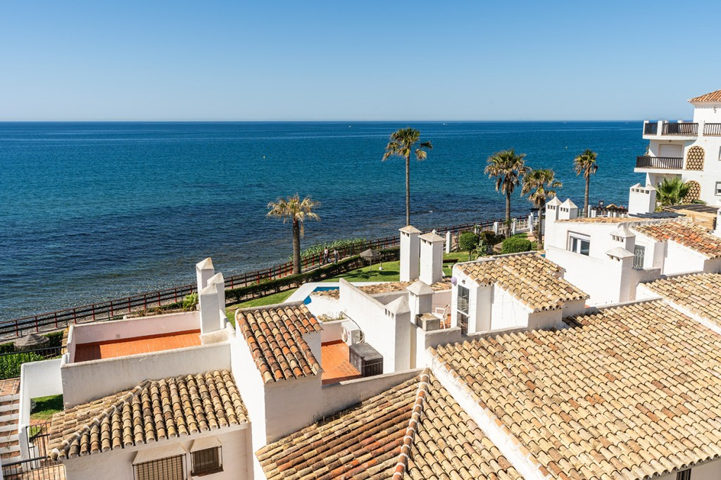 Penthouse in Calahonda in second line beach with amazing sea views and offering on two levels two bedrooms, two bathrooms, a kitchen, bright living room with sunny terrace and a roof terrace with views to the Mediterranean Sea and with sun all day. Sold furnished and equipped with AC hot and cold, marble floors and including one underground parking space. Gated complex with beautiful garden, pool and access to the wooden board walk and to the beach.