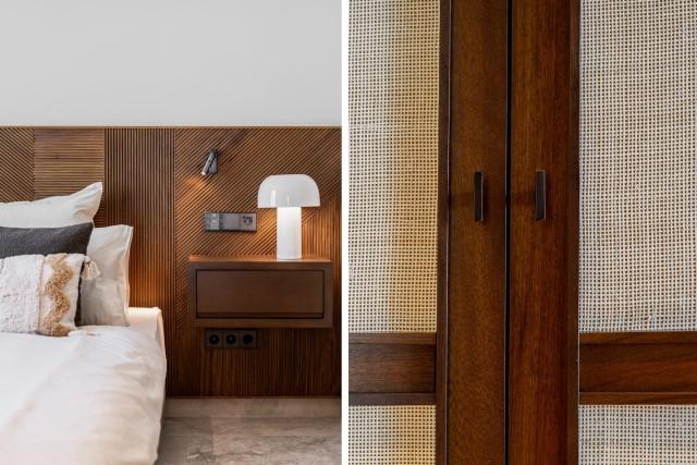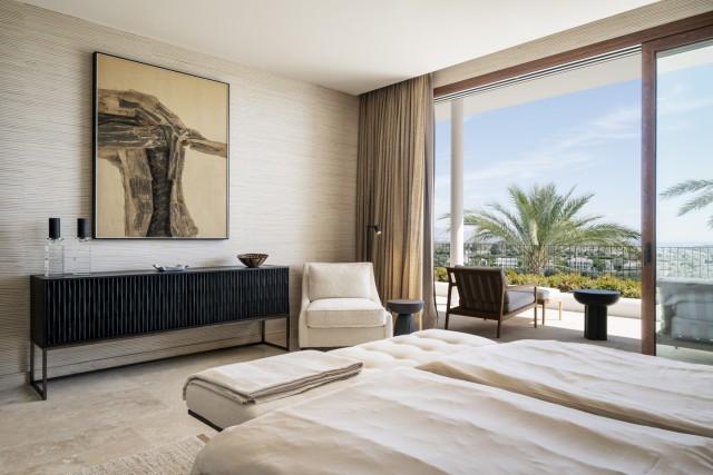 The apartment includes three spacious en-suite bedrooms, each adorned with warm sand-toned Carrara marble bathrooms, complete with double sinks and showers. The master suite boasts a bespoke walk-in closet, a bathtub, and an immense window that opens directly onto the terrace. Characterful wooden finishes and high-quality materials throughout enhance the inviting atmosphere. The muted palette in sandy tones creates a warm aesthetic, harmonising beautifully with the natural surroundings.