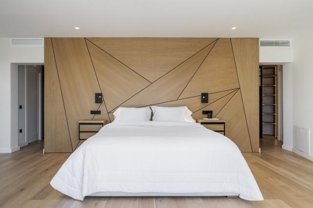 Back in the hallway, to the left, a door leads to a bright corridor that leads to three bedrooms (one en suite with a shower, bathtub, and walk-in closet) and a full bathroom. All rooms offer views of the park, pool, and sea. A staircase (or elevator) leads up to the top floor, dedicated entirely to the master bedroom, with two independent bathrooms connected by a spacious walk-in closet with glass doors. The bed and sitting area face the Mediterranean, as does the private terrace with glass railings.