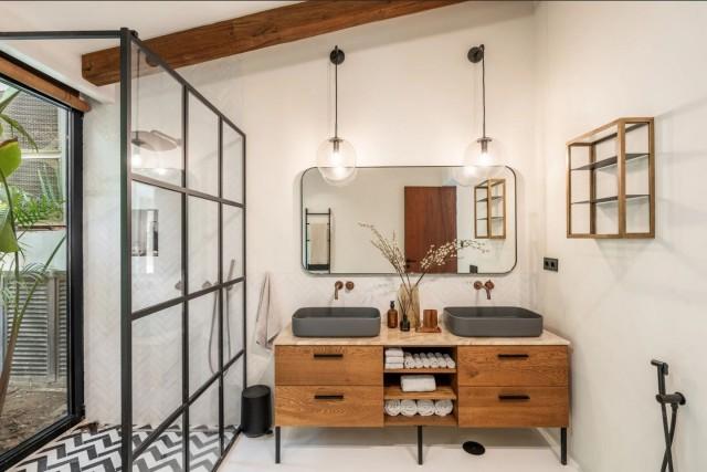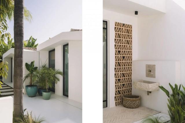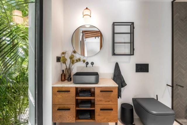 To the right of the door, there is a reception toilet with a large window facing outside, furnished with designer pieces that resemble works of art. In front, one of the five spacious bedrooms that are part of this home. From the very first steps, you can identify the common threads throughout all the spaces: high, gabled ceilings with natural wooden beams that give it a cozy vibe. The white polished cement floors create a seamless flow throughout the property. The windows in the bathrooms let the outdoors into each space while acting as curtains to preserve privacy.
