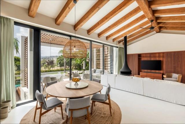 Located in the heart of the Golf Valley, Nueva Andalucía, renowned for its world-class golf destinations, this villa offers a prime front-line position on one of the area’s top greens. Situated in an exclusive gated community, the villa provides a serene and private retreat, surrounded by a privacy wall and lush vegetation. It is rustic and sophisticated, spacious and cozy, warm and airy thanks to its immense windows and high ceilings. It carefully combines an Andalusian charm with contemporary style, and noble materials with artistic details.
