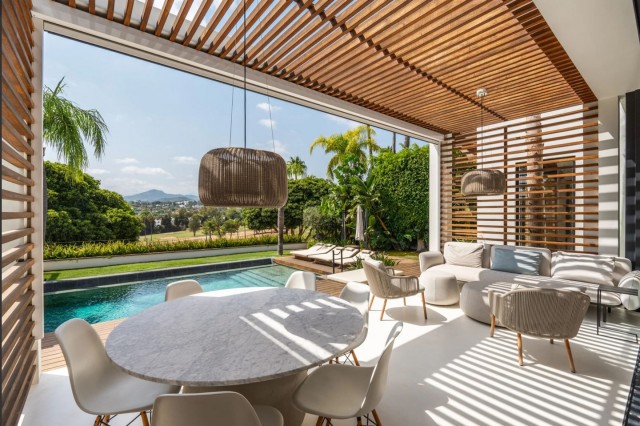 The entire house is designed to appreciate the views of the mountains, the Los Naranjos golf course, and the lush surroundings from any space. This is possible because it features immense windows, many of which disappear into the walls, creating an in-out effect that allows you to enjoy the home and the landscape simultaneously. This begins the moment you enter: The main door is glass, so from the façade, you can see the view of the golf course and the mountains on the other side.