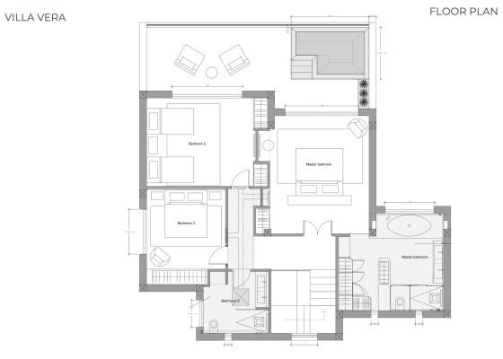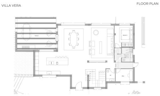 The open-plan kitchen and living area extend seamlessly to a covered terrace with an outdoor kitchen and pergola—perfect for al fresco dining. Upstairs, the master suite enjoys a private terrace with a jacuzzi under the stars, while three more bedrooms keep the family close. Two additional rooms on the entry level include a flexible space, ideal as a kids’ room or office.