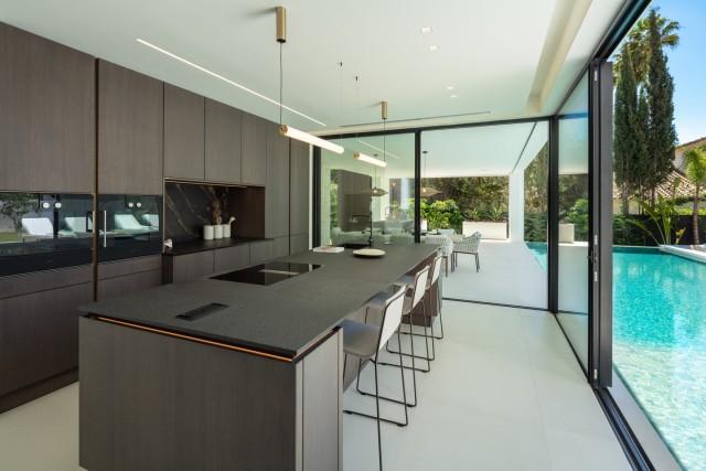 Located between Las Brisas and Aloha Golf Clubs, this modern five-bedroom villa is designed for a seamless integration of indoor and outdoor living. A striking double-height entrance leads to an open-plan living area where a glass wall lets the outdoors in. The modern kitchen, equipped with high-end appliances, centers on a sleek island and seamlessly integrates with the outdoor barbecue and covered dining area.