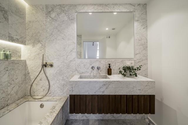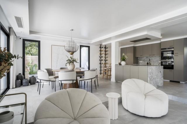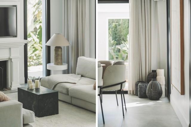 Set in Nueva Andalucía, this villa blends traditional Andalusian architecture with sleek, minimalist interiors. Designed for family living, this bright and spacious home unfolds across three levels, featuring a muted palette, natural stone bathrooms, and wood accents that add warmth and texture.