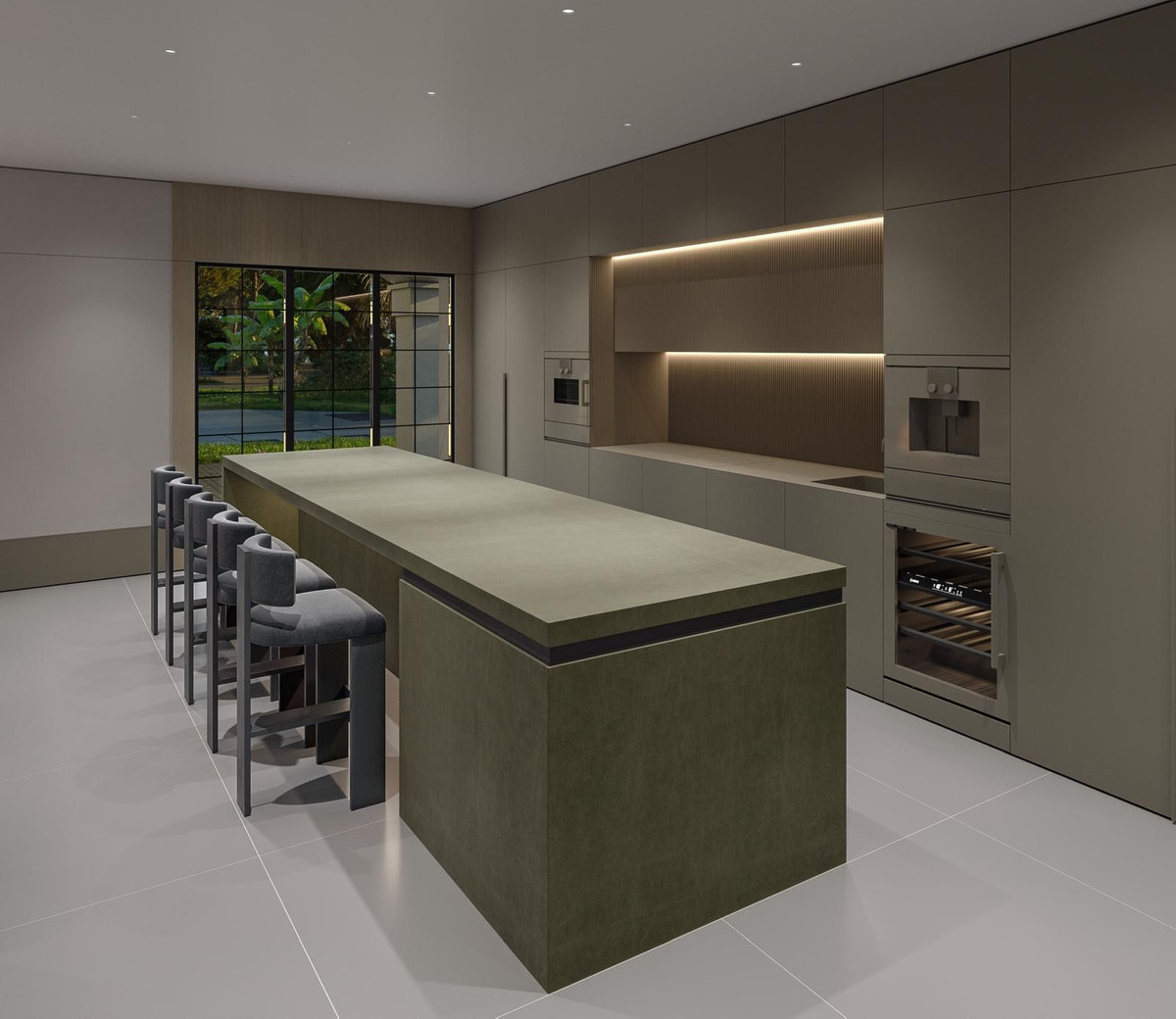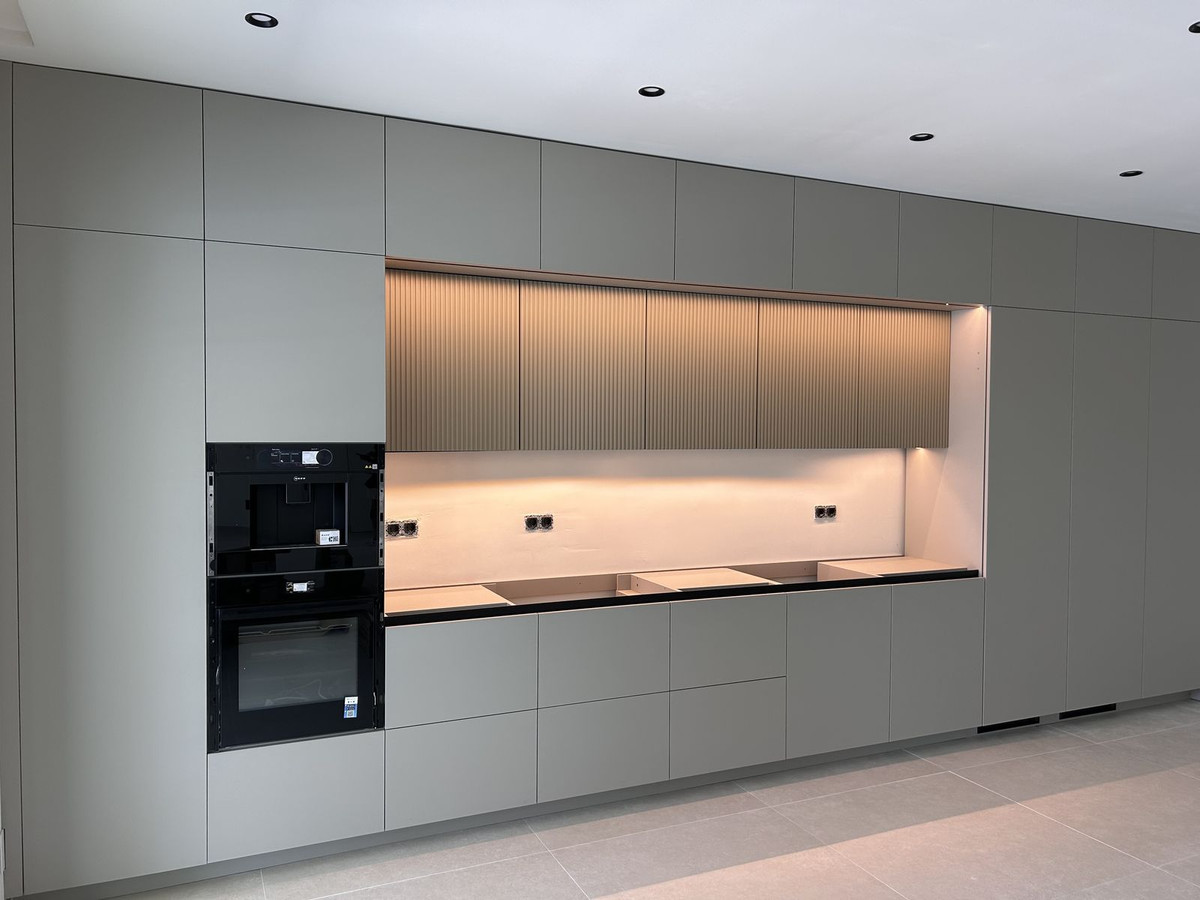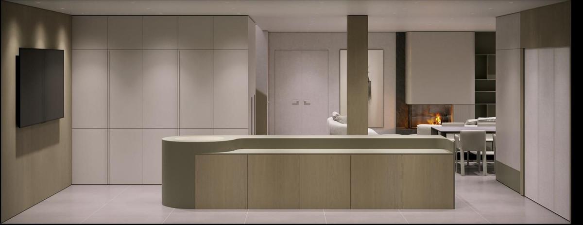 The modern kitchen is designed with the latest trends in mind and is equipped with a built-in two-door refrigerator, a wine cooler, and a cooktop with an integrated extractor, making it both aesthetically pleasing and highly functional.