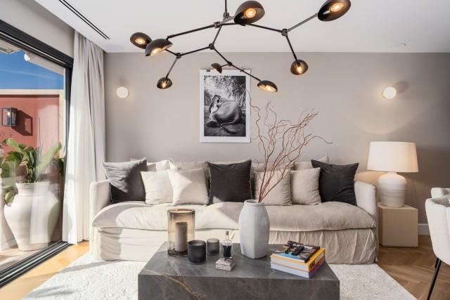 The home includes three spacious bedrooms, each with en-suite bathrooms, and a stylish guest powder room that enhances the property’s functionality. Interior design emphasizes natural light, openness, and warmth, supported by southeast orientation and floor-to-ceiling Cortizo Slim windows and terrace doors—especially in the living room, where they fully slide to one side to create an expansive connection to the outdoors. Throughout the apartment, elegant wood flooring in chevron herringbone pattern lends timeless character, while all doors extend from floor to ceiling, enhancing the sense of height and volume in every room. Interior styling is refined yet comfortable, featuring furnishings from high-end design labels such as Bycrea and Zoco Home.
