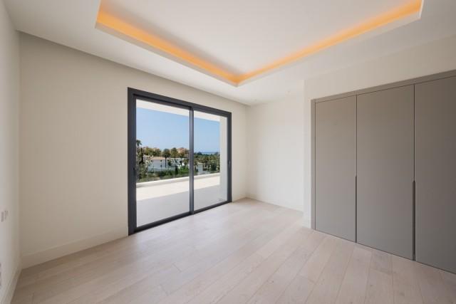 From its exclusive rooftop access, which includes a Jacuzzi and pre-installed barbecue area, panoramic views of the golf course and the Mediterranean Sea can be enjoyed. The main floor features an open-plan layout with a living room, dining room, and designer kitchen with a natural stone island, as well as a secondary kitchen for events. Large windows connect to the saltwater infinity pool surrounded by tropical vegetation. It also includes an en-suite guest bedroom.