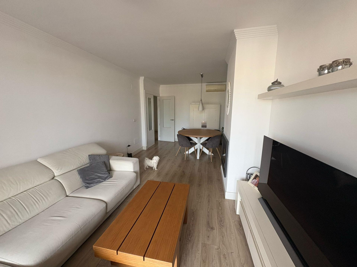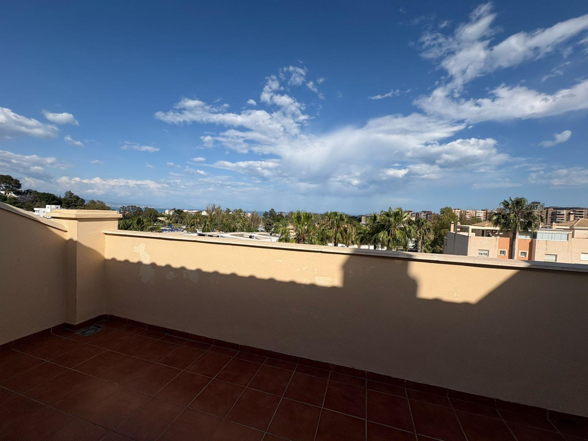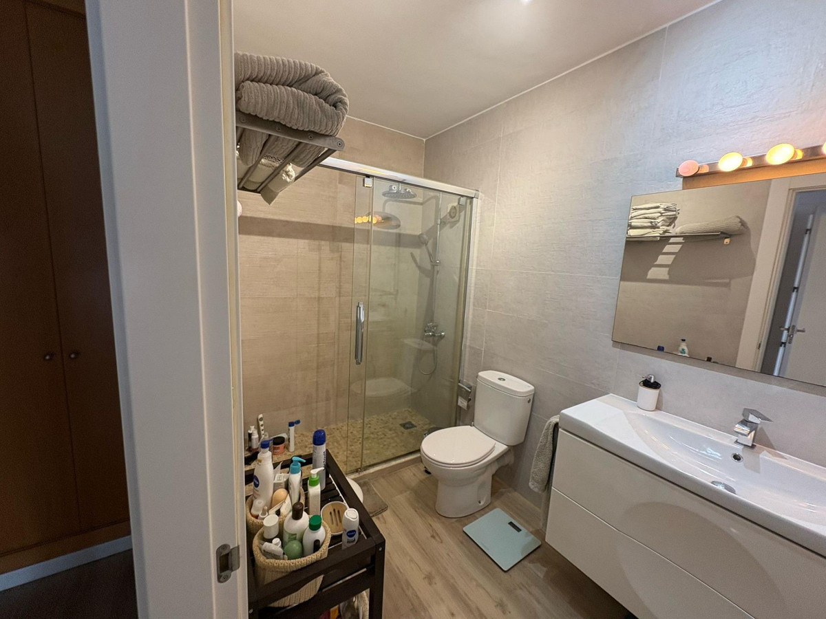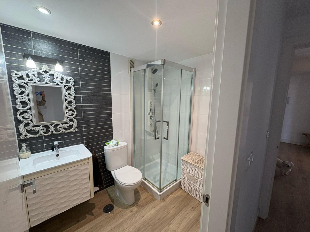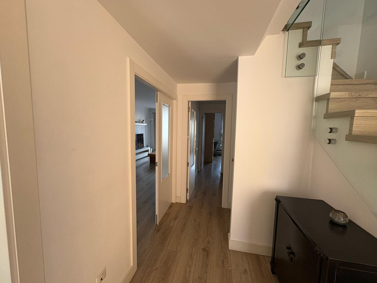 Upon entering, you’re welcomed by a spacious and bright foyer featuring a modern staircase with a tempered glass railing, adding a contemporary touch to the home. The main floor offers a functional layout with a fully equipped kitchen, separate laundry room, a full bathroom, one bedroom, and a spacious living-dining area with direct access to a generous terrace. From here, you can enjoy breathtaking open views of the Bay of Málaga — a true daily luxury.