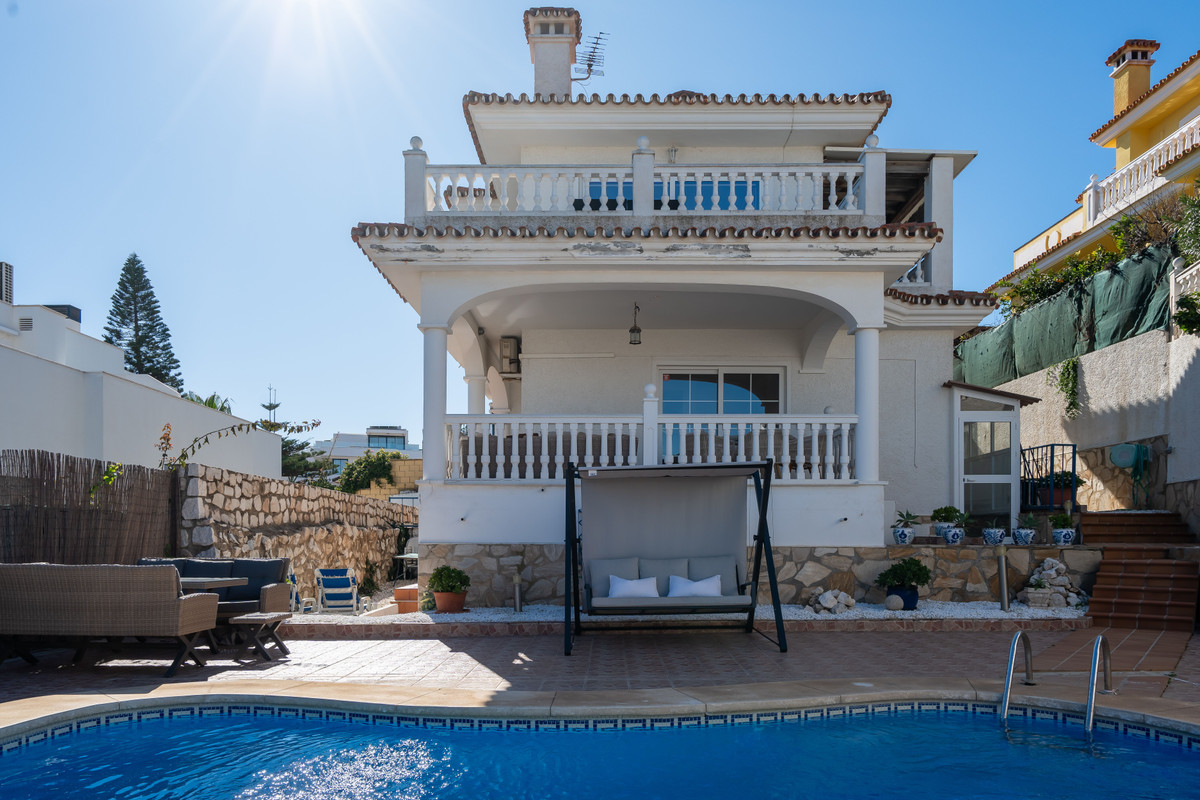 This stunning villa, perfectly positioned near the beach and Castillo Sohail, offers a unique blend of modern design, comfort, and breathtaking views.The entrance level welcomes you with a bright open floor plan, featuring a modern newly renovated kitchen, a spacious living area, a guest toilet, and a sun drenched terrace. A stylish bedroom on this level adds convenience and flexibility.On the second floor, three elegant bedrooms and three contemporary bathrooms provide a serene retreat. The master suite is a standout, boasting panoramic views of the sea, the castle, and Fuengirola, with direct access to a private terrace and an idyllic spot to enjoy the scenery.The lower level functions as an independent apartment with its own entrance, offering two sleeping areas, a fully equipped kitchen, and seamless access to the private pool. Ideal for guests, extended family, or rental income, this space adds exceptional versatility to the home.Designed for effortless enjoyment, the outdoor area is low maintenance and features a private pool and a brand-new sauna with a shower, your personal oasis for relaxation.With its unbeatable location, spectacular views, and flexible layout, this villa is a rare gem and perfect as a family home, a luxury vacation retreat, or a high return investment. Don’t miss this opportunity to own a piece of paradise by the beach. Schedule your private viewing today!