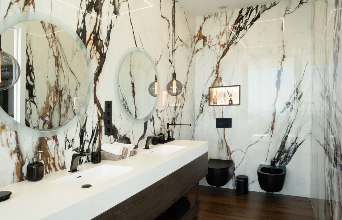 The open-plan layout is enhanced by top-quality materials, smart home technology, individual air conditioning/heating, and a private elevator connecting all floors.