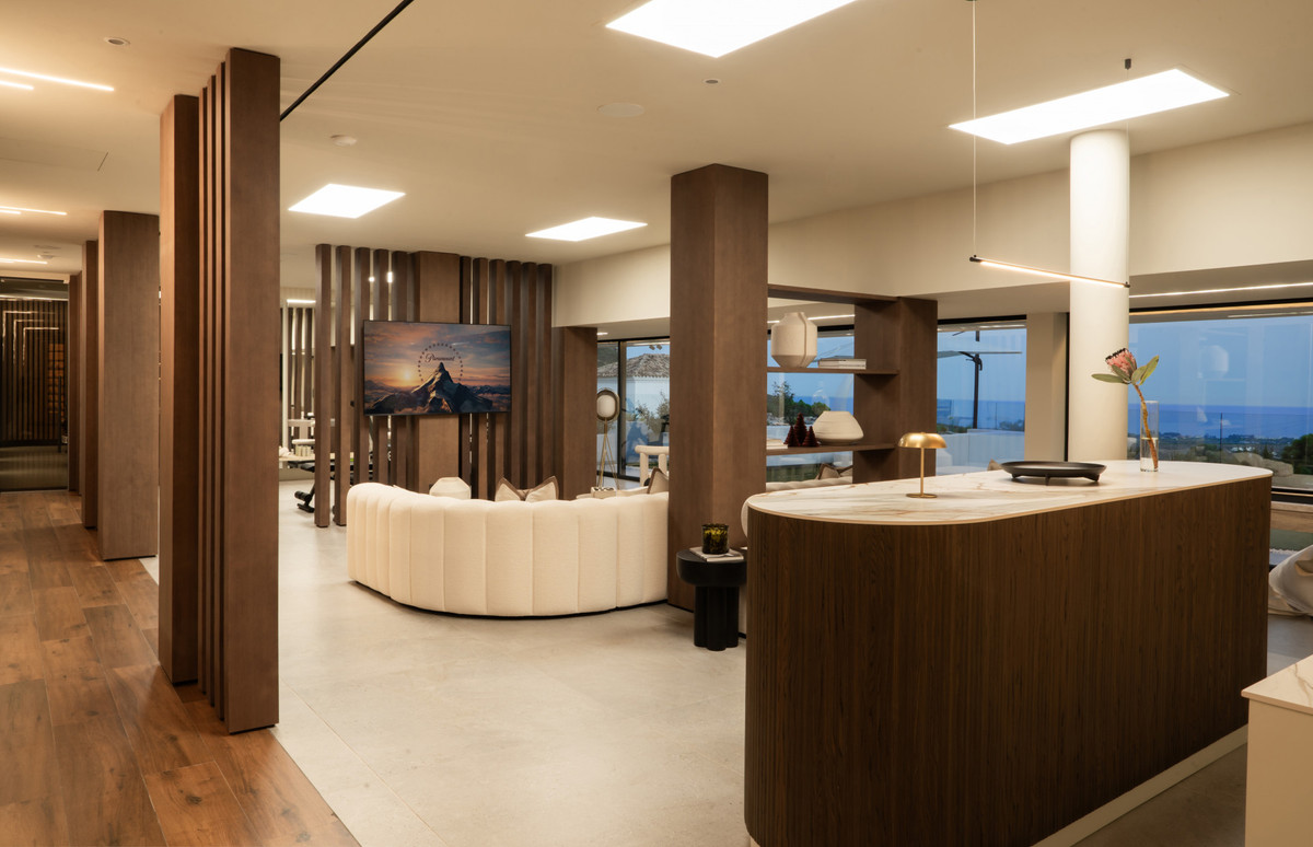 The spectacular basement level enjoys rare sea views and houses a full private wellness retreat, including a 24-meter heated indoor pool, sauna, a cold plunge pool, gym, and stylish bar. It also features a 16-seat cinema, bodega, second living room, and laundry area—ideal for both relaxation and entertaining.