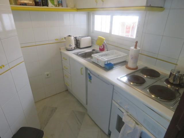 This cosy 2 bedroom, 2 bathroom apartment is located in a quiet and beautiful urbanization in Calahonda. This elevated ground floor looks out over a lovely green area and "Arroyo". There is small kitchen, dining area and sunny living room. The apartment need some updating but that is reflected in the price. Not much out there for this money anymore. The urbanization has a beautiful pool area.