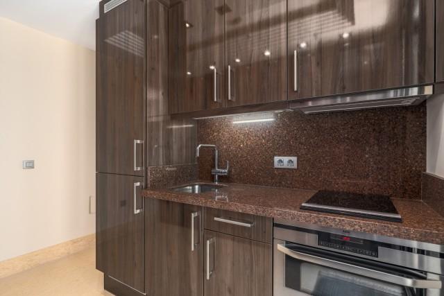 The main living area is arranged in an open-plan format, combining the lounge, dining space, and kitchen in a bright, cohesive setting that extends directly to the terrace. Thanks to its southeast orientation, the property benefits from abundant natural light throughout the day, enhancing both the indoor and outdoor areas. The kitchen is fully equipped and integrates smoothly into the living space, offering a clean, modern aesthetic with high-end appliances and functional storage solutions.