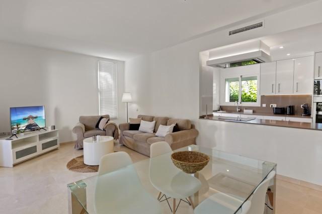 The apartment features a bright living and dining area with an open-plan, fully fitted kitchen, ideal for modern living. The master bedroom has its en-suite bathroom, while the second guest bedroom enjoys access to a separate bathroom. From the living space, step directly onto your covered terrace and garden, perfect for relaxing or entertaining outdoors.