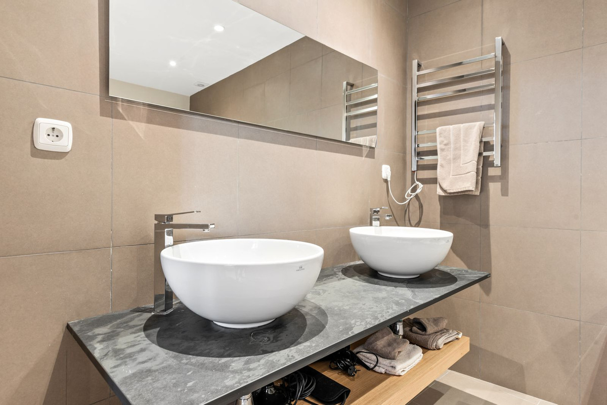 The property features underfloor heating and full air conditioning, making it suitable for both holiday living and permanent residence. Each bedroom has its own en-suite bathroom, and there is also a gym with a sauna for added comfort.