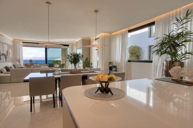 The main level comprises an expansive open-plan living and dining area with floor-to-ceiling patio doors that open onto generous private terraces, showcasing spectacular views across the Mediterranean. A sleek, fully fitted kitchen with premium appliances flows effortlessly into the living space, ideal for both relaxed day-to-day living and elegant entertaining. The master bedroom suite offers direct access to the terrace, while two further guest suites and a guest cloakroom complete this floor.