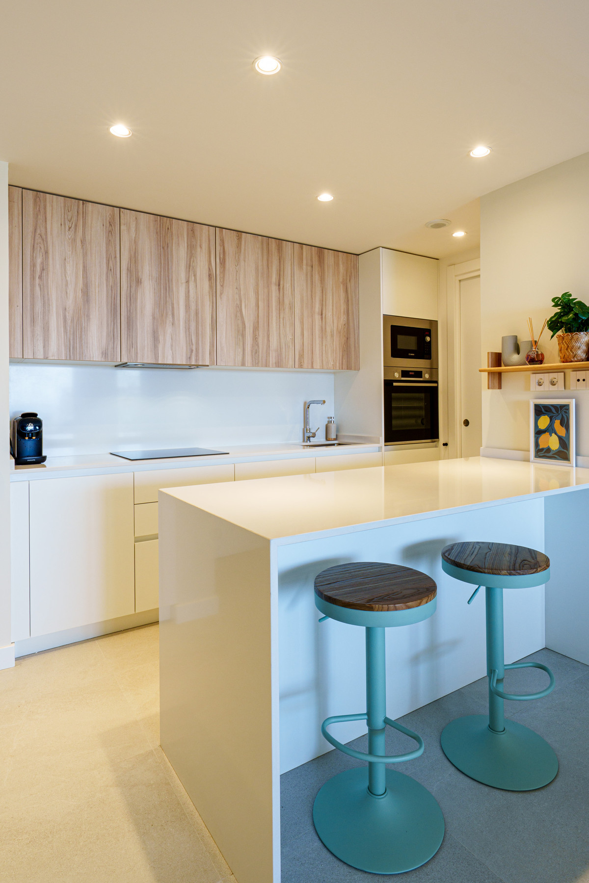 The modern kitchen, open to the living area, is fully equipped with high-quality appliances and ample storage, making it a functional yet stylish space for cooking and entertaining.