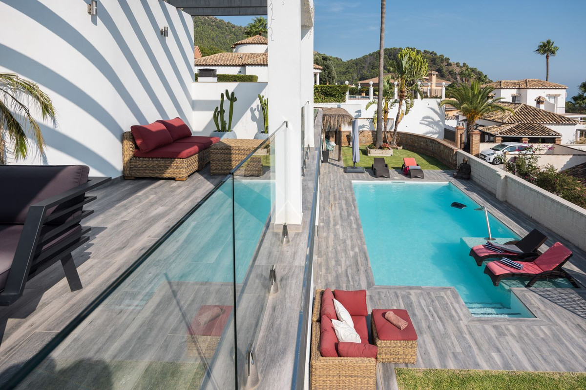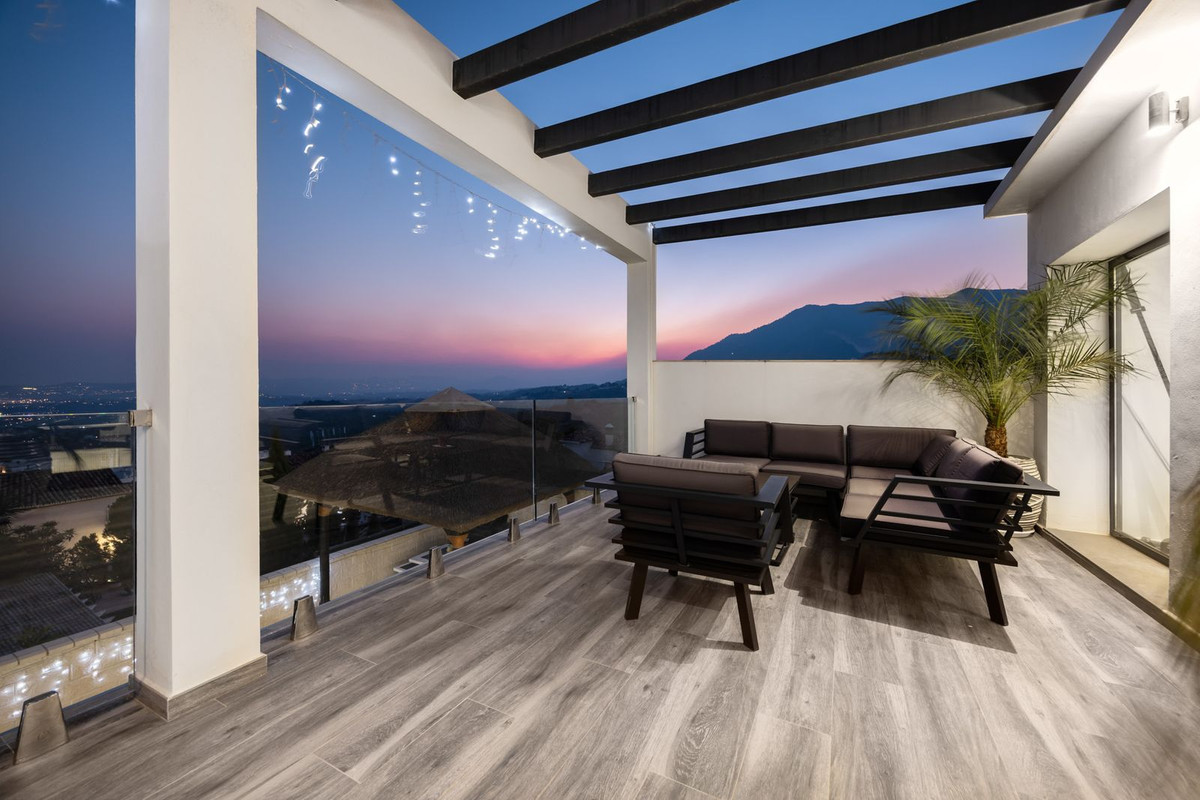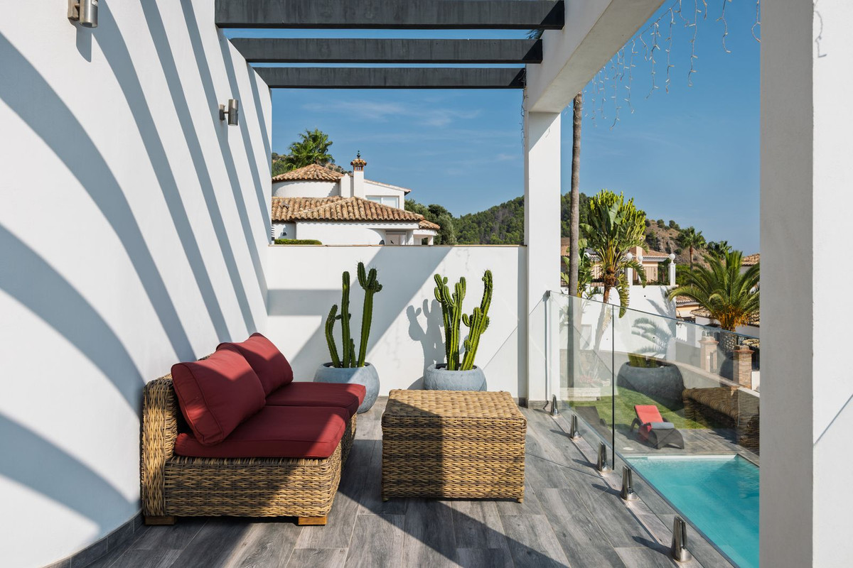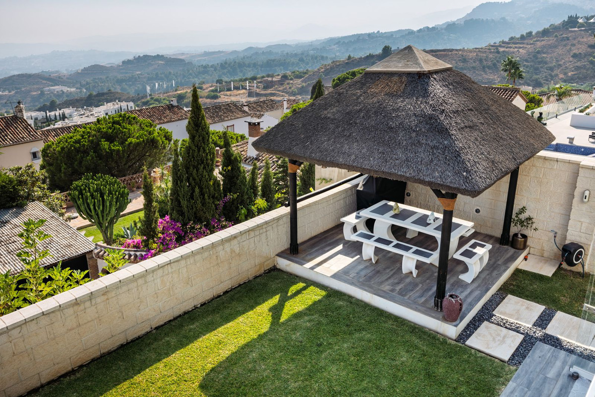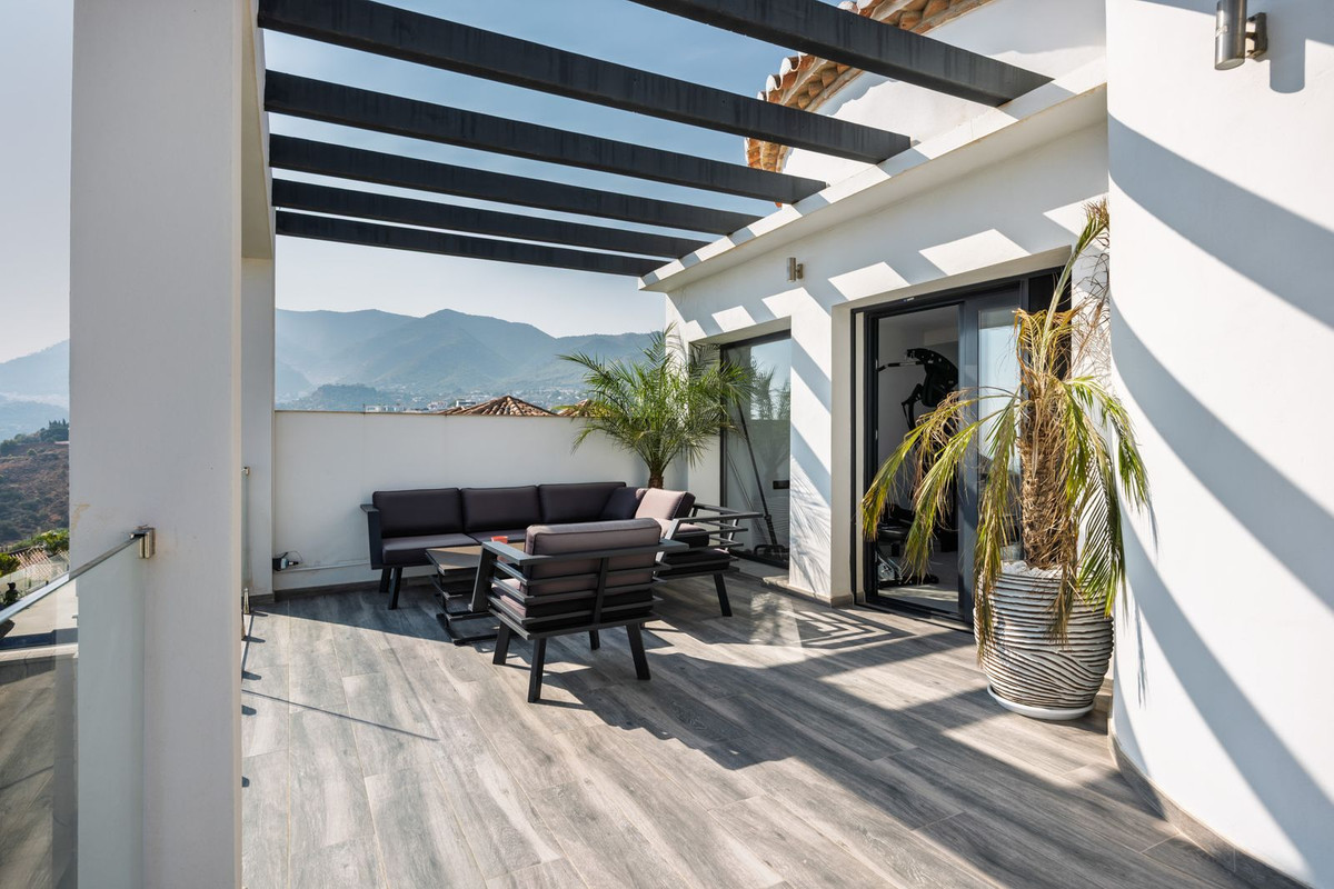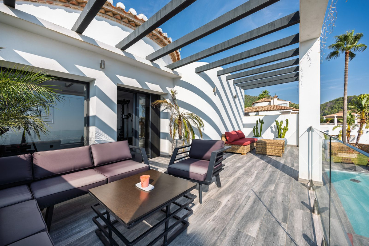 Spectacular villa that perfectly blends Mediterranean style with contemporary design, combining traditional charm with modern comfort and top-quality finishes. Located in the prestigious Buena Vista area of Mijas, it offers a unique lifestyle in a peaceful and private setting, with stunning panoramic views of the Mediterranean Sea, the coastline, Africa, and the mountains. Set on a plot of 800 m² with a built area of 251 m², the property is in immaculate condition and ready to move into. Its location is unbeatable: just 5 minutes from Fuengirola, 2 minutes from the exclusive Higuerón commercial area with all kinds of services, 10 minutes from the finest beaches of the Costa del Sol, and only 20 minutes from Málaga city center and the airport. The villa is mainly distributed on one floor, ensuring functionality and comfort. Upon entering, the home immediately stands out for its brightness and sense of space thanks to the open-plan design. The modern fully fitted kitchen seamlessly integrates with the spacious living room with fireplace, creating a warm atmosphere that connects with the terraces and garden through large sliding doors. The exterior is a true private retreat, featuring a swimming pool with sunbathing area and hydromassage jet, a barbecue area ideal for outdoor gatherings, and a landscaped garden with fruit trees, all with open views to the sea and mountains. The property offers four bedrooms. The master bedroom, with en-suite bathroom and walk-in wardrobe, has direct access to a terrace with a private jacuzzi. Two additional bedrooms with their own bathrooms are located on the opposite wing of the house, ensuring privacy for family or guests. On the upper floor, a versatile space currently used as a gym with bathroom and private terrace can easily be converted into an independent suite with spectacular views. Additional features include a cinema room, sauna, laundry room, air conditioning, solar panels for hot water, and parking space for three vehicles, including a closed garage and covered carport. An ideal residence both for year-round living and as a luxury holiday home, perfect for those seeking privacy, comfort, and a strategic location on the Costa del Sol.