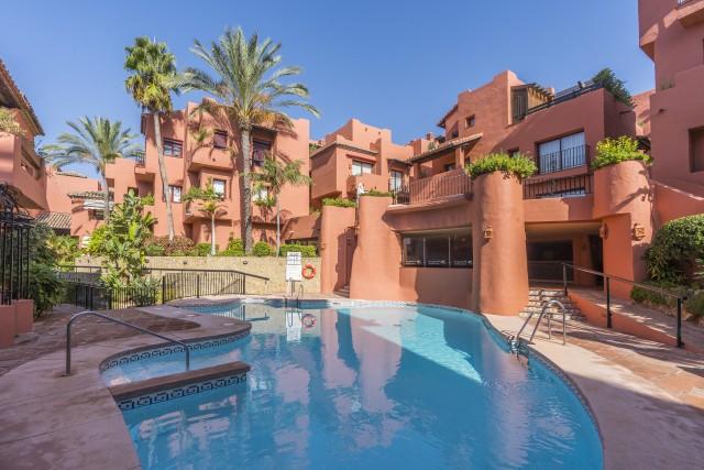 Ample and bright top floor apartment in Elviria Playa in East Marbella offering three bedrooms, two bathrooms, a glazed and covered terrace, bright living room with access to terrace and a very large fully equipped kitchen with separate laundry room. Equipped with marble floors, AC hot and cold, awning, blinds, underground parking space and storage room. Lift. Complex with three pool areas, a small gym with sauna and within a small walk from the beach and all local amenities.