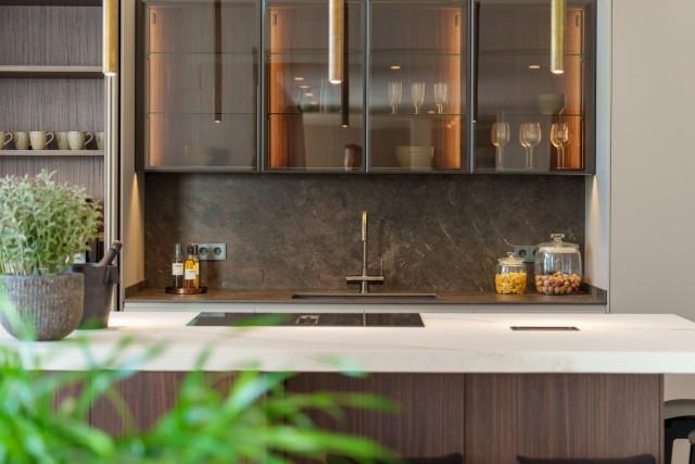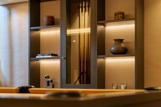 Inside, the villa features a striking open-plan layout with vaulted ceilings, full-height glazing, and a designer kitchen with a central island. Five luxurious bedroom suites include a panoramic principal suite with private terrace and walk-through dressing room. On the lower level, enjoy a private entertainment lounge with bar, wine cellar, and billiards area.