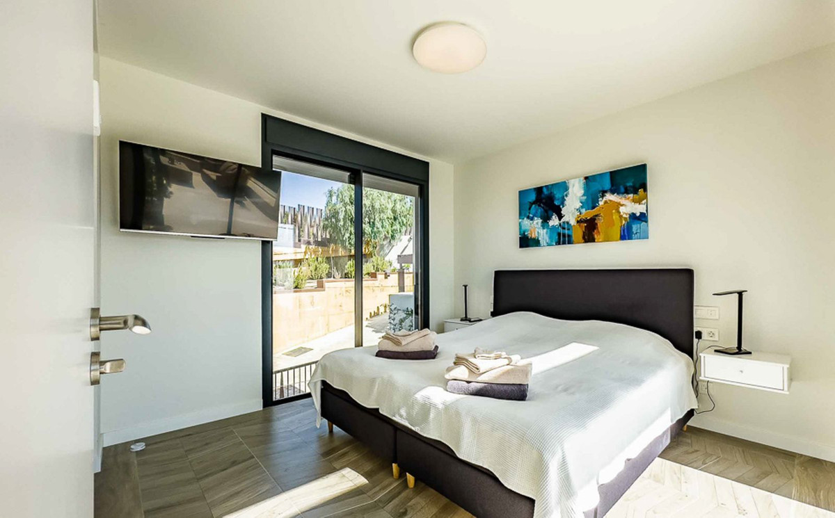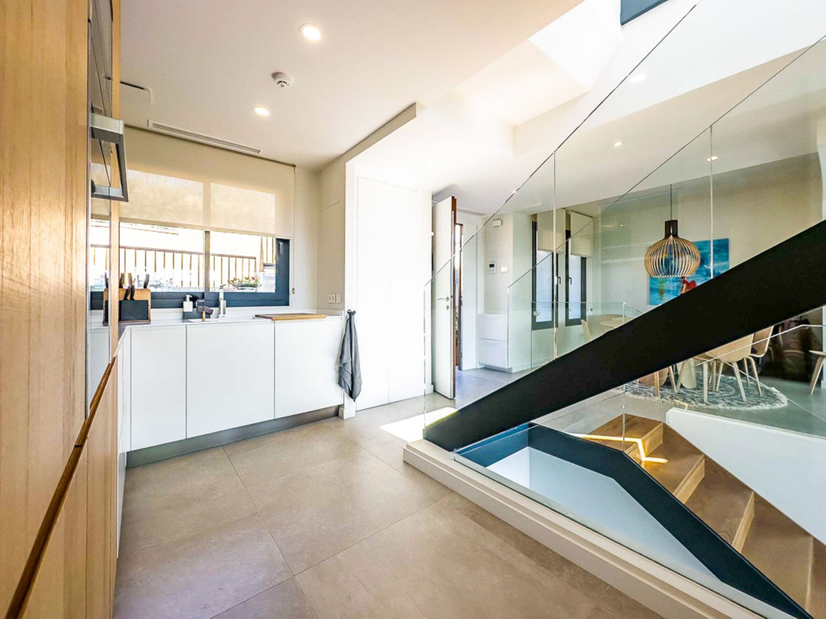 Spread over three levels and 181 m², the house offers bright spaces, floor-to-ceiling windows, and stunning views of the Mediterranean, golf course, and mountains. It features three spacious bedrooms with en suite bathrooms, a fully equipped kitchen, open-plan living and dining areas, private pool, and several terraces totaling 160 m² — including a rooftop solarium for unforgettable sunsets.