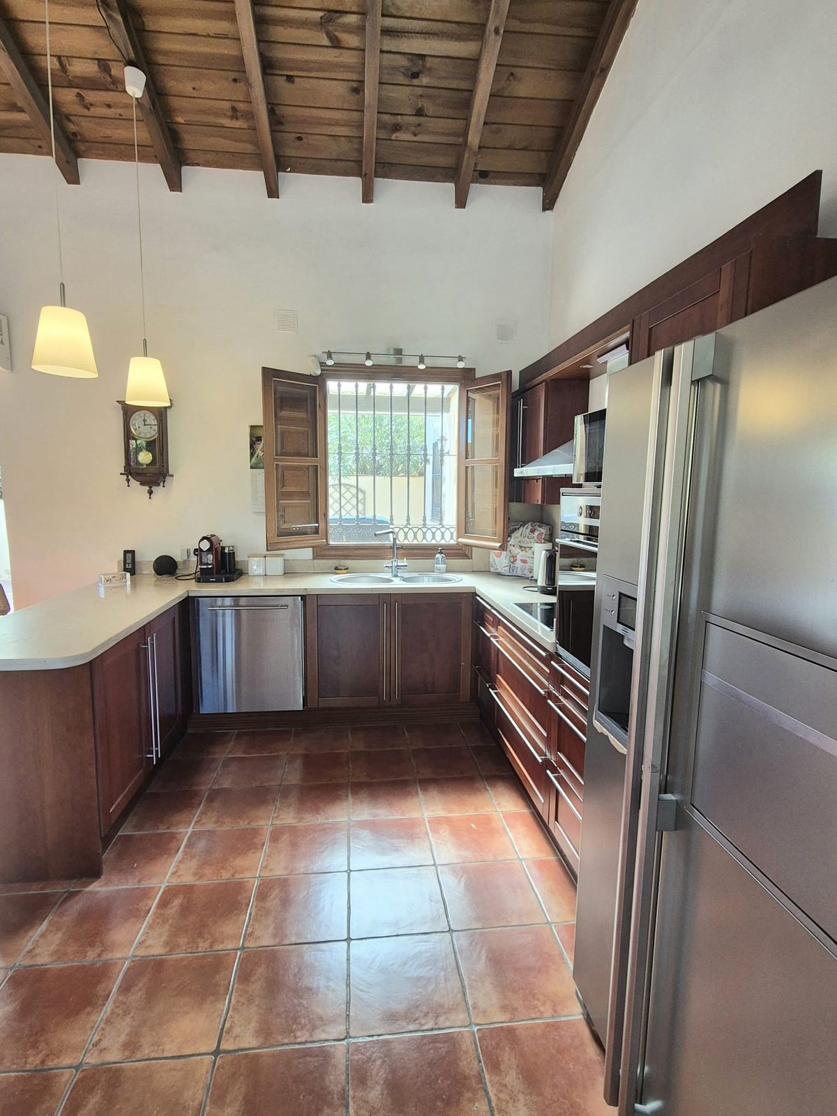 As you enter the property through the electric gates you have a stoned road that leads to the finca, with ample car parking, 2 car carport / garage, at the front of the property there is a nice covered terrace to enjoy alfresco dining, which in the future you also can close in with glass curtains. Entering the finca into the open living room / kitchen, you have high ceilings with wood beams, the kitchen is fully fitted and in prestine condition, and the living room has a wood burner and pellet stove. From here is also access to the back part of the house where there is a nice courtyard and you can combine being outside and in as well. From the living room you have a hallway that leads you to the 2nd double bedroom, guest full bathroom and large master suite with a big ensuite bathroom, this is a huge room with lots of potential for making it even into 2 bedrooms, you have skylights, a window and door that accesses the same back courtyard, nice fitted wardrobes. The master bathroom has a large soaker tub and free standing separate shower.