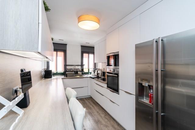 Apartment on one level in the complex El Mirador de Santa Maria Golf in Elviria in East Marbella. The apartment offers three bedrooms, two bathrooms, a fully equipped modern kitchen, a large and bright living room with access to the covered and glazed terrace. Fully refurbished and equipped with AC hot and cold, wooden floors and sold furnished. South orientation. The price includes a double underground parking space and a large storeroom. Gated complex with three pools and gardens just next to the Santa María Golf Course and within a short drive to all amenities as well as the beach. The centre of Marbella and shopping centres are a 10 minutes drive away.