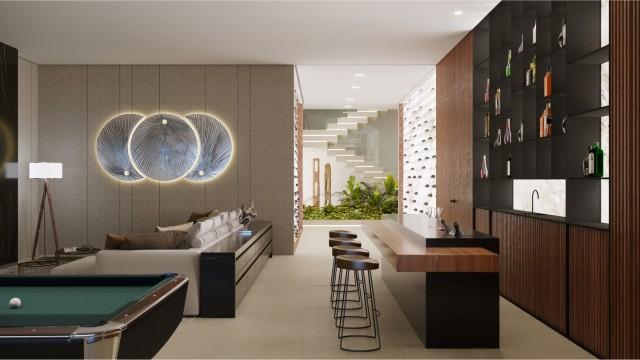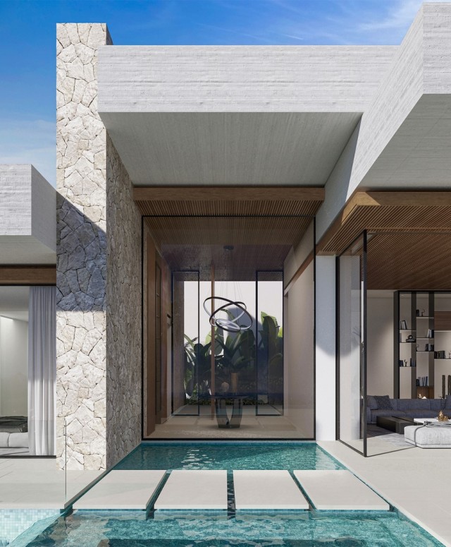 The architectural concept focuses on seamless indoor-outdoor living. At its core, the villa will feature an infinity-edge pool that opens to wide coastal vistas. An adjacent sunken lounge and outdoor kitchen create a refined setting for open-air dining and gatherings. Subtle water features throughout the exterior design enhance the tranquil ambiance and integrate the home with its natural surroundings.