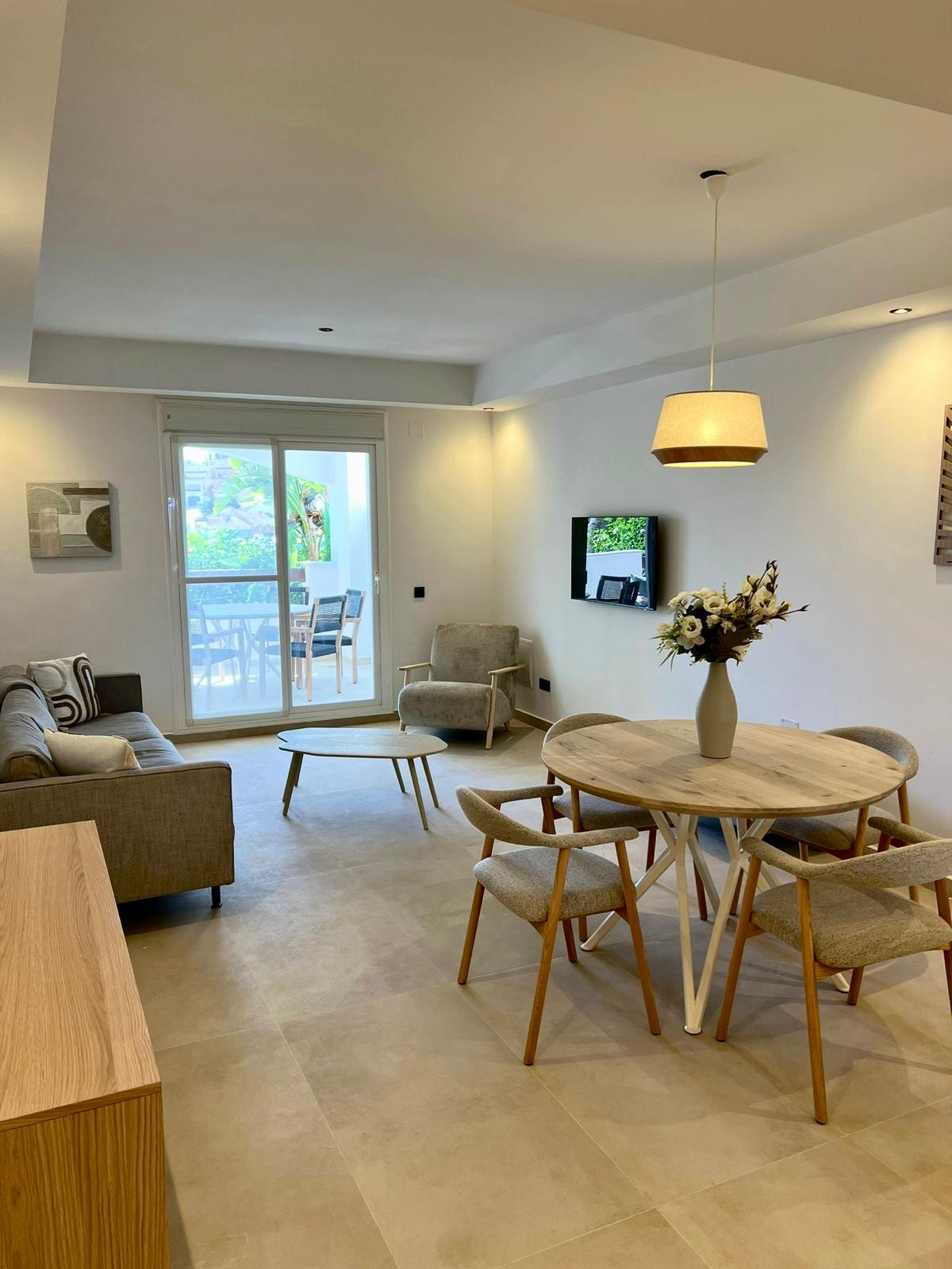 The apartment features two bright and comfortable bedrooms, a modern bathroom, and an open-plan living area that seamlessly connects to the terrace. Every detail has been carefully designed to create a warm and welcoming atmosphere.