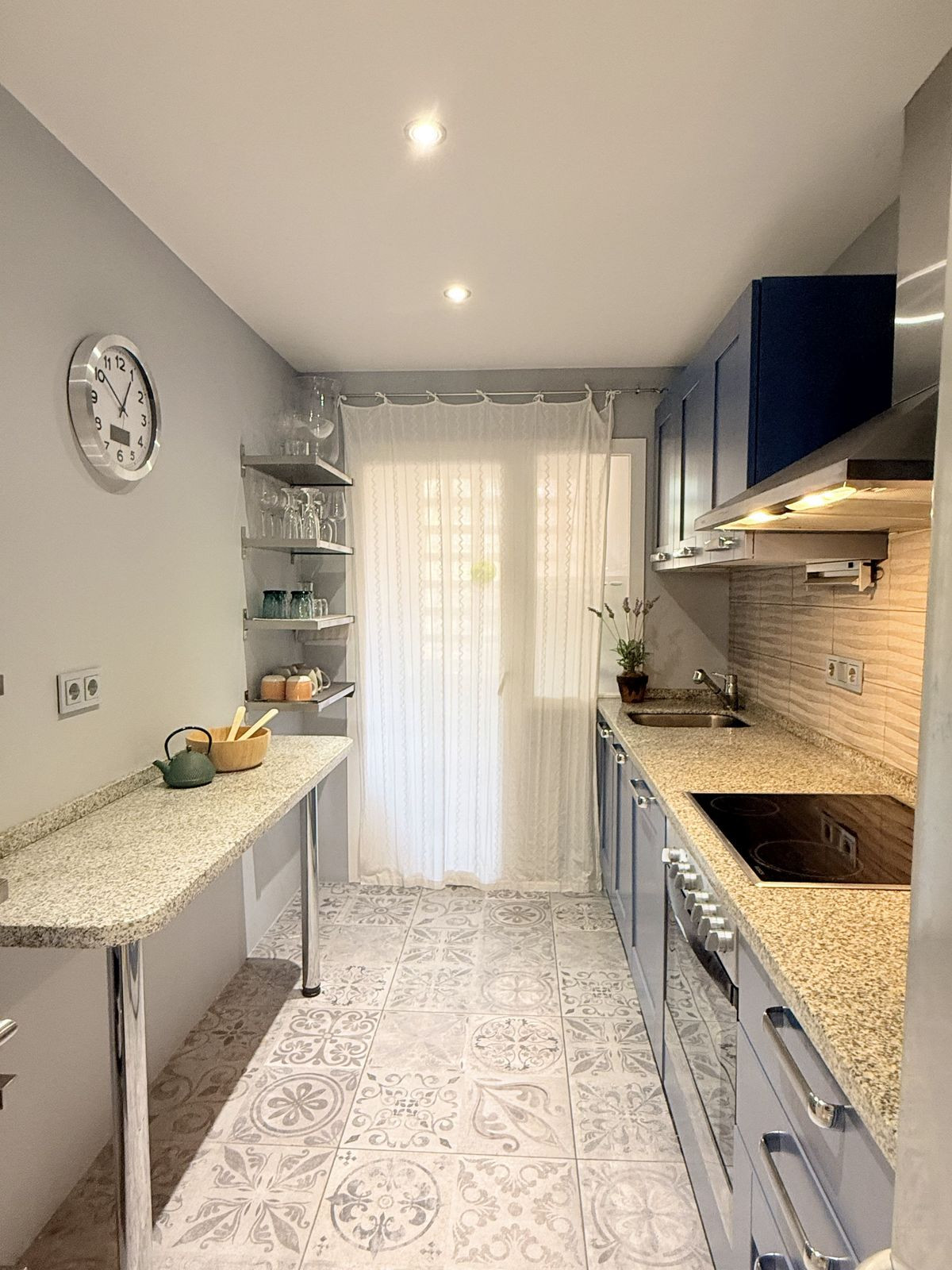 The beautiful galley-style kitchen showcases blue shaker cabinetry and decorative tiled flooring, complemented by a separate laundry room and additional storage areas. One designated parking space is included.