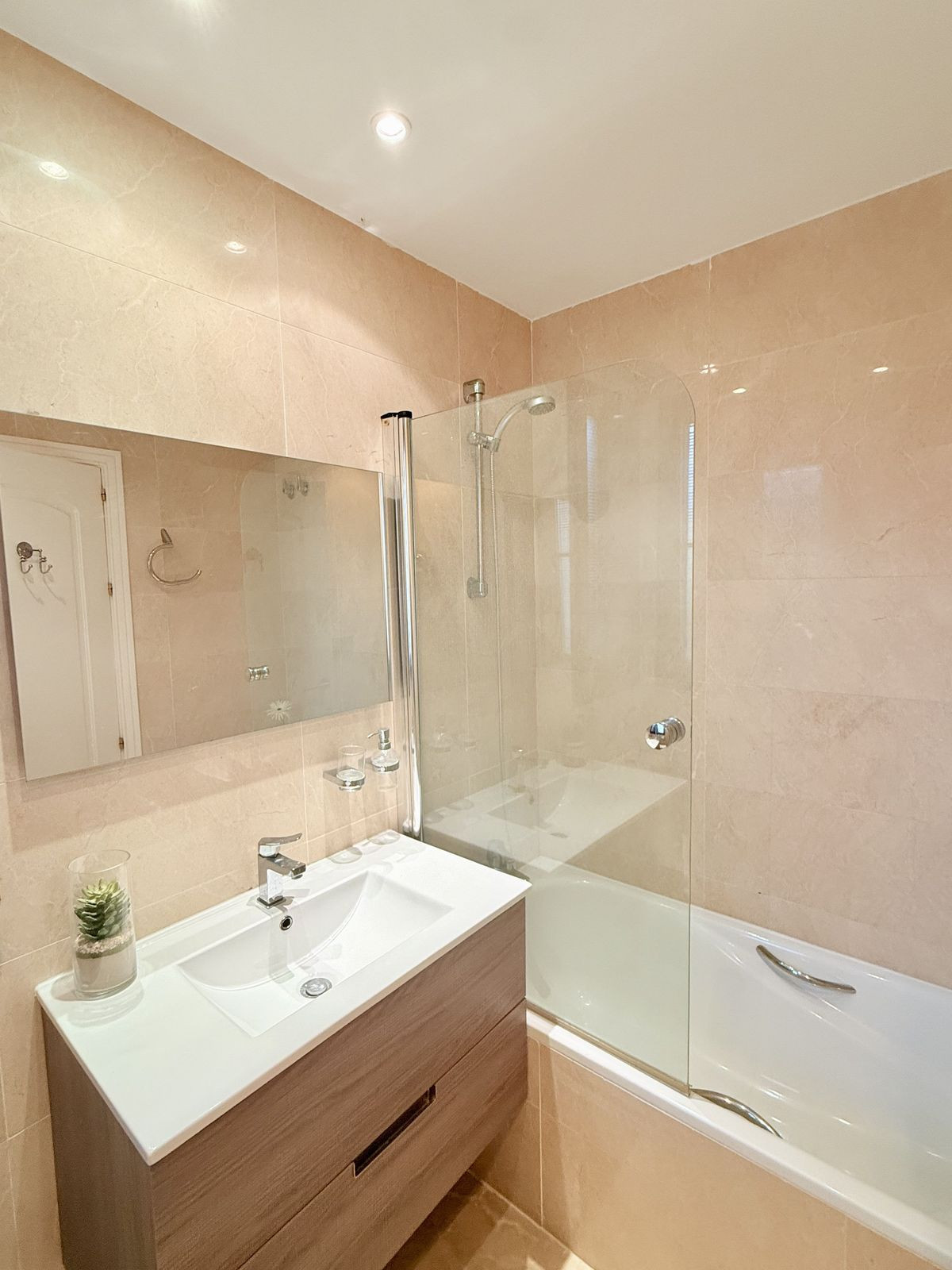 The property includes two spacious double bedrooms. The master suite features an ensuite bathroom with bathtub and direct garden access, while a second full bathroom serves the additional bedroom and guests. Ample built-in wardrobe space throughout ensures excellent storage .