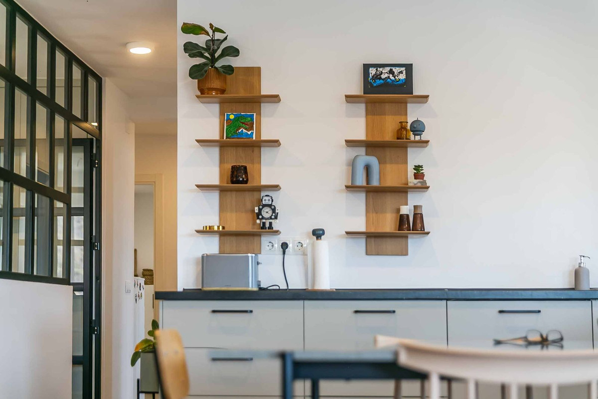 The property offers three double bedrooms, two modern bathrooms and a living-dining room with an integrated kitchen that opens up to natural light. The third bedroom, which is glazed and connected to the living area, is ideal as an office or guest room, adding versatility to the space. It also has a practical laundry room hidden behind wooden slats, maintaining the order and aesthetics of the flat. Every detail of the flat has been designed to offer comfort and contemporary style, with elegant finishes and a functional layout.