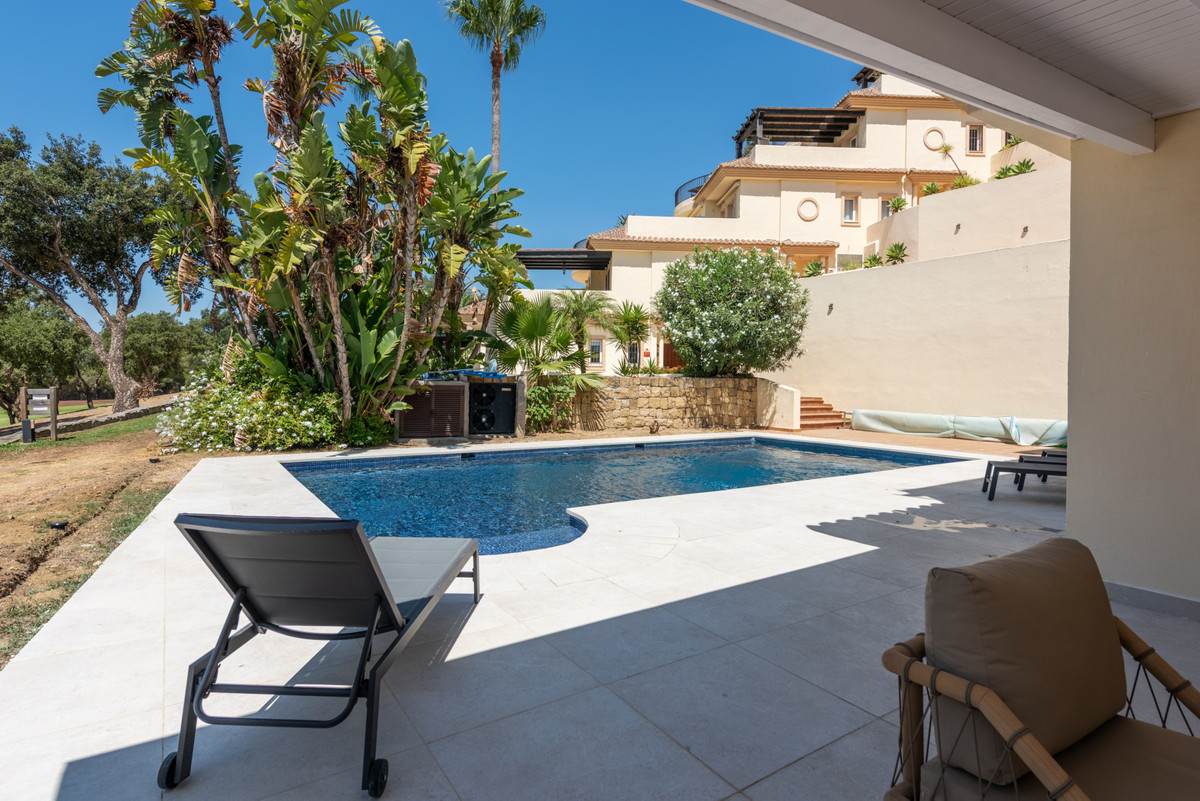 Spacious and bright, it offers a beautiful fully equipped open-plan kitchen and a large living/dining room with breathtaking views of the magnificent San Roque golf course. Both the kitchen and the living area feature large sliding glass doors that open onto a spacious terrace of over 70 m² and a private garden totaling 379 m², facing the golf course.