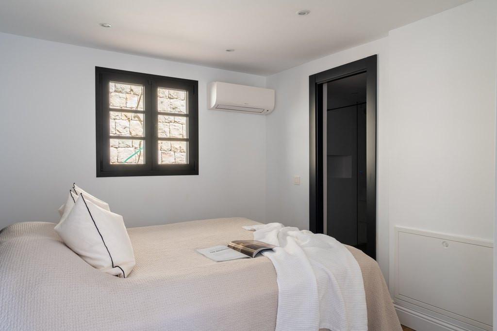 A separate studio with its own bathroom offers endless possibilities—as staff accommodation, a guest house, private office, or creative retreat. Every detail has been carefully renewed, from the underfloor heating with Daikin heat pump to the individual air-conditioning, wooden-effect tiles, Villeroy & Boch bathrooms, Tres fixtures, and the Vela bathtub. The home is equipped with double-glazed aluminum windows, a fully automated home and surveillance system, and brand-new plumbing and electricity, all connected to mains services.