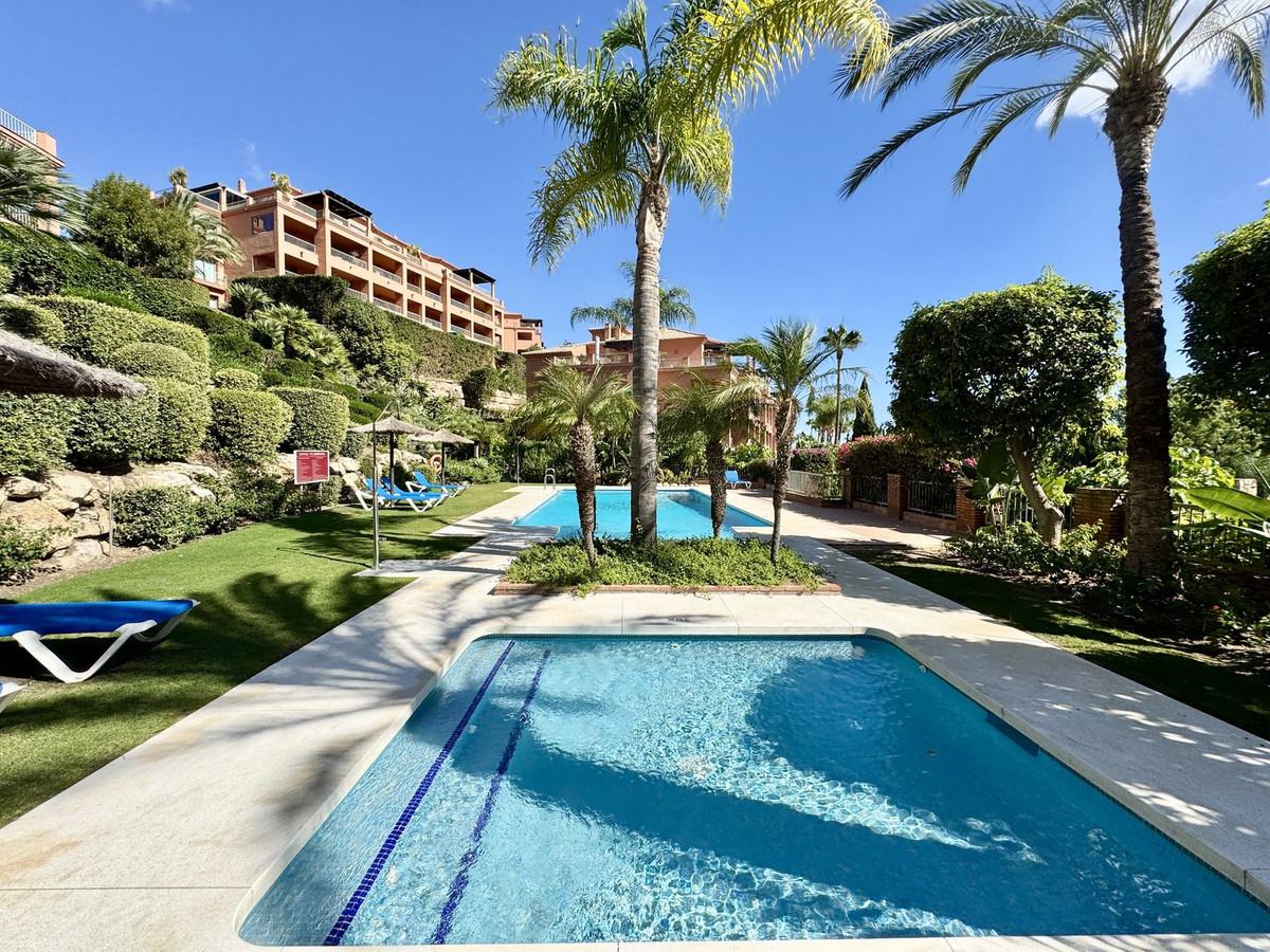 This beautiful ground-floor apartment boasts fabulous views of the sea and golf courses. Located in the exclusive Royal Flamingos community, next to the 5-star Villa Padierna Hotel, it features a master bedroom with an en-suite bathroom, a second bedroom with a separate bathroom, and a fully equipped kitchen with a utility room.