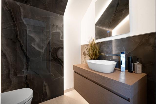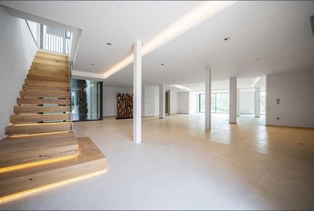 The rooftop solarium presents 360° views of the surrounding mountains, golf course, and coastline — ideal for entertaining under the stars. The basement offers space for a gym, cinema, or bar, plus a private guest suite with garden access. With smart home technology, underfloor heating, and parking for three cars,