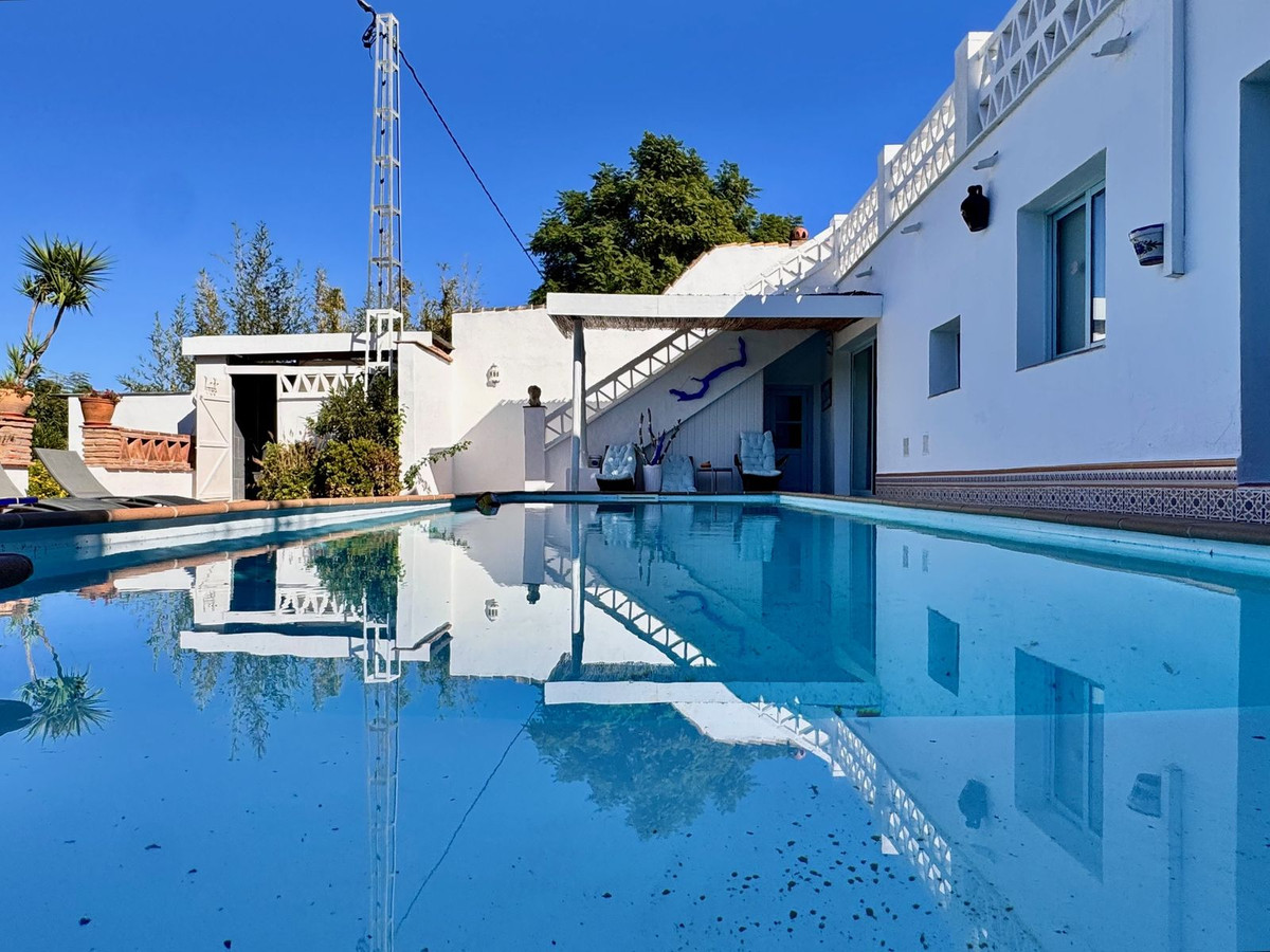 The single-storey house preserves its authentic Andalusian charm, with exposed wooden beams, fireplaces, and cosy corners both inside and out. It includes 5 bedrooms (one with independent access by the pool), 4 bathrooms, a spacious living room with pool views, and a master bedroom with en-suite bathroom and walk-in wardrobe.