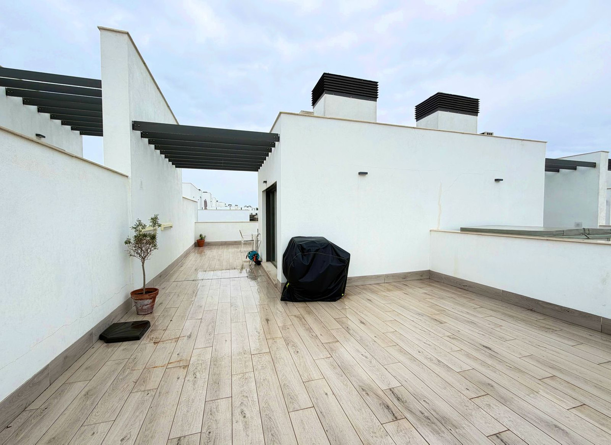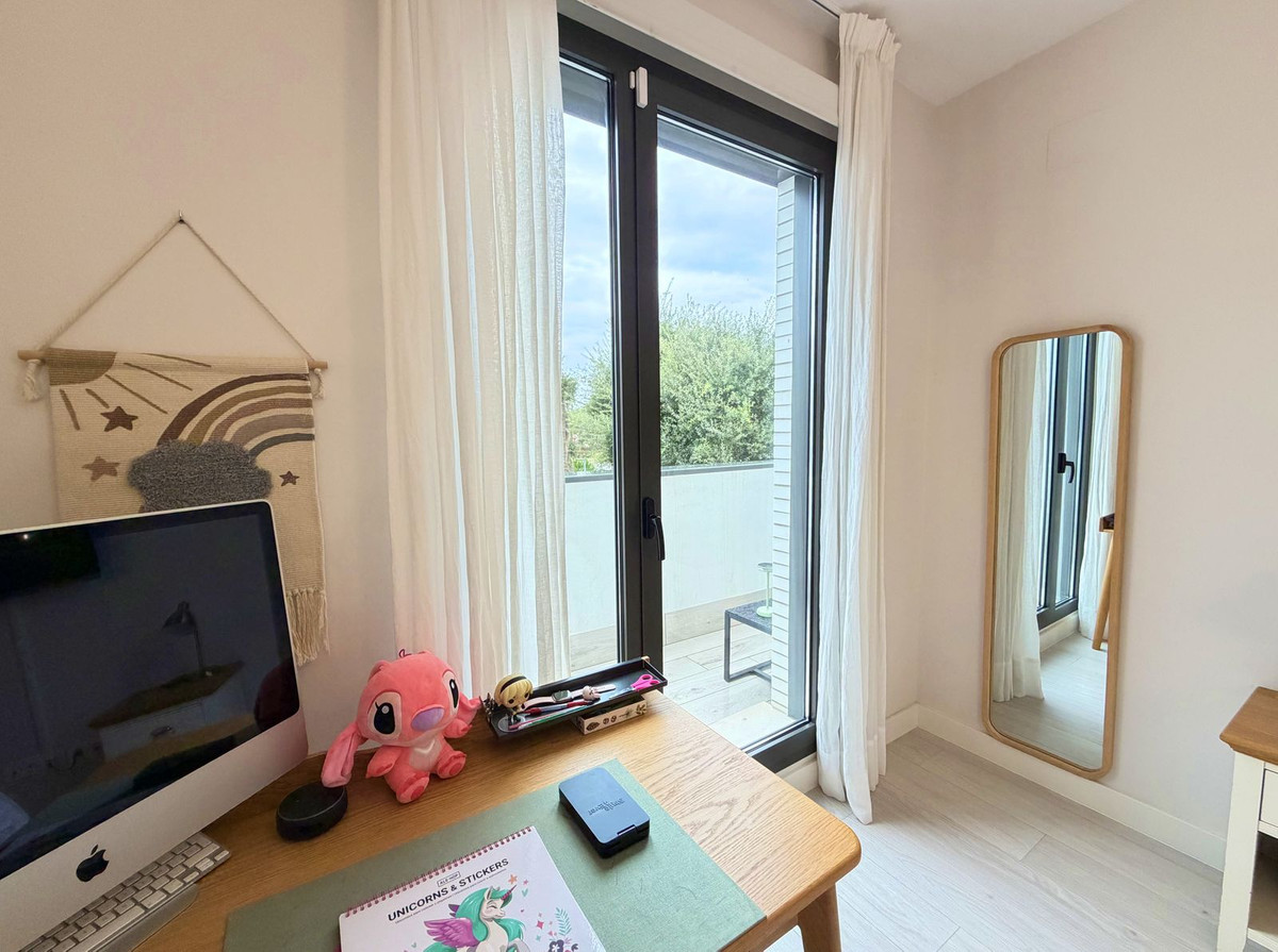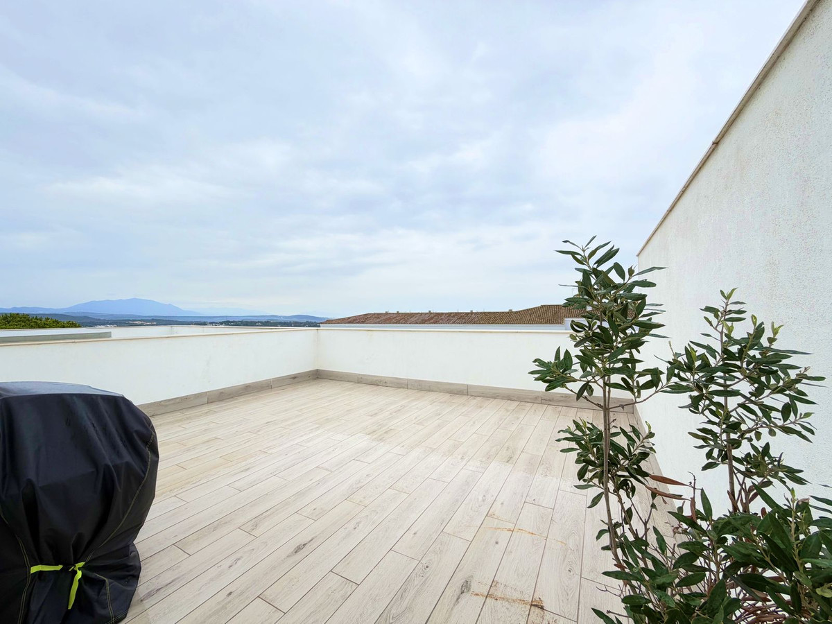 On the upper floor, the master bedroom stands out with its en-suite bathroom and a glazed balcony. The other two bright bedrooms feature built-in wardrobes, share a full bathroom, and have access to a second balcony overlooking the community entrance. On the top level, the solarium offers a spectacular setting: a spacious, open area with panoramic views of the sea, golf, and natural surroundings, perfect for a chill-out zone, a barbecue area, or simply enjoying the sun and privacy. Two parking spaces, electric blinds, high-quality finishes, and the option to convert the current study into a fourth bedroom complete a home designed for uncompromised living.