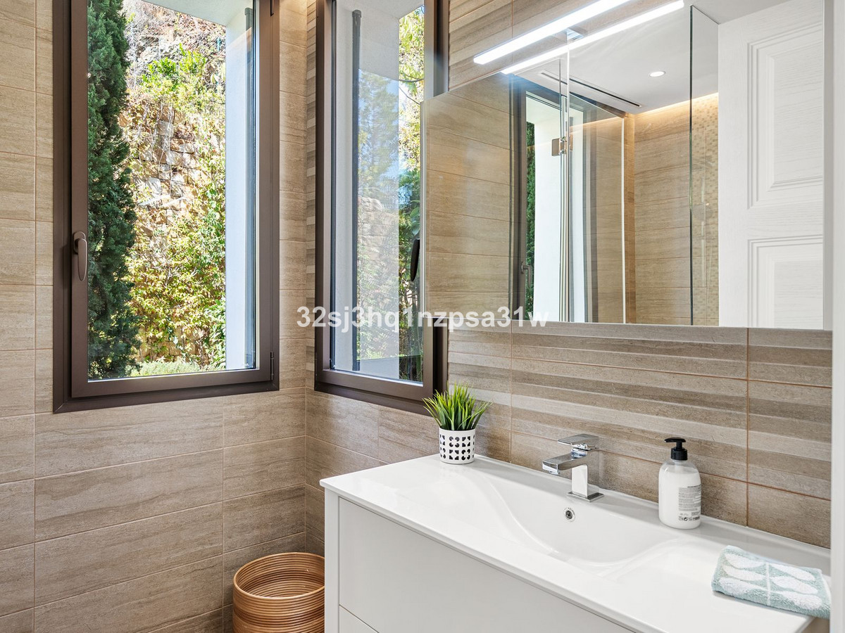 Malaga and Gibraltar International Airports are both less than an hour away. Surrounded by the same high-end properties and lush greenery as Benahavis, this spectacular 1,158 m² villa sits on a large 3,560 m² plot. This stunning property meets modern standards, offering respect for the environment, tranquility, privacy, and luxury. It boasts magnificent views of the Los Arqueros golf course, the lush green hills and pine-covered mountains of the Mediterranean, as well as stunning panoramic views of the coast and sea as far as Africa.