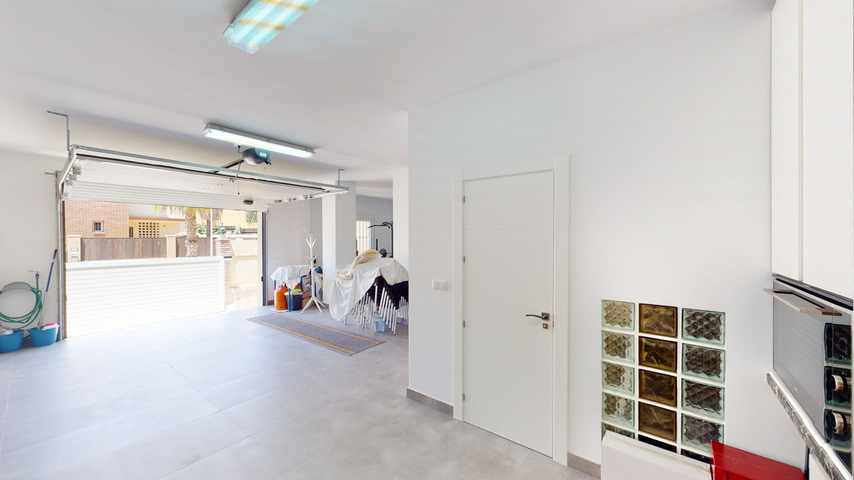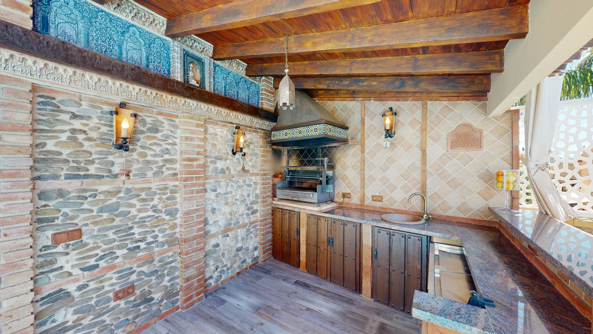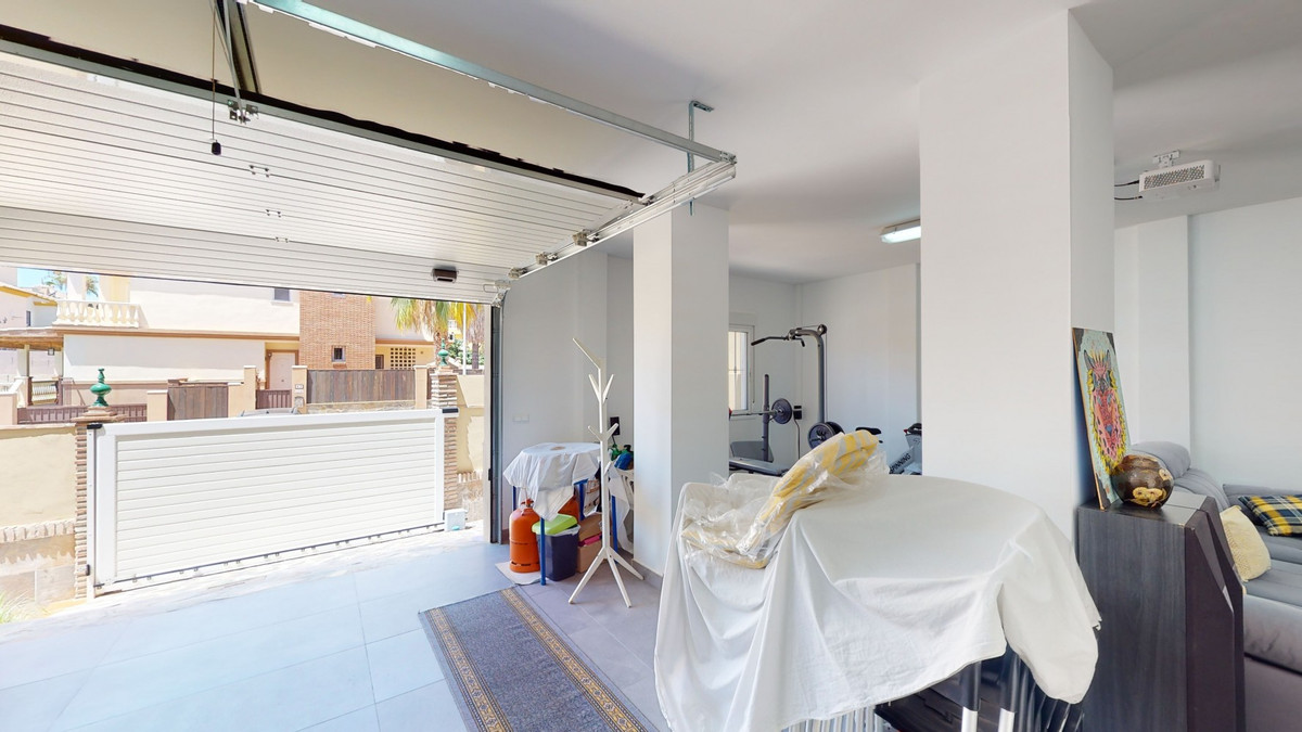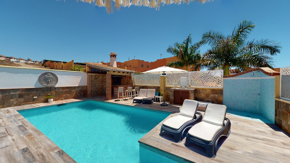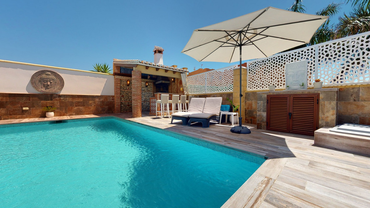 Beautiful, renovated semi-detached house in the quiet residential area of Viña Malaga. The three-storey house has two entrances. It is divided into 3 bedrooms, 3 bathrooms, a guest toilet, 2 kitchens, a living room and a home cinema. The outdoor area offers various chill-out areas, a pool, and an outdoor kitchen with barbecue. In the basement there is a double garage, which is now used as a cinema, as well as a gym, a kitchen and a guest toilet. This part can be used for entertaining friends, or as an independent apartment with 2 bedrooms. There is direct access from the garage to the ground floor. The ground floor has an entrance hall with a wardrobe, a bathroom with a shower, a kitchen with all modern appliances and an exit to the balcony, and a living and dining room with a fireplace. From the living room there is also an exit to the beautiful outdoor area. There you will find the large patio with many seating and lounging areas around the 4 x 8 m pool, an outdoor shower and stylish decorations. There is also a rustic bar and a barbecue area with water and electricity. In the evening, everything is romantically lit and you can enjoy wonderful meals with family and friends. On the first floor are the three bedrooms, one of which has a dressing room and on-suite bathroom. Each bedroom has its own balcony with sea views. The house was built in 2002 and was recently renovated. Don't miss the opportunity to visit this beautiful semi-detached house, which is only 5 minutes away from the beach, the motorway and the golf course. We are pleased to be able to present this dream property to you soon, either personally or via virtual viewing. Because this world is unique - just like our Axarquía. In Andalusia. On the Costa del Sol. Here, on the sunny side of life...