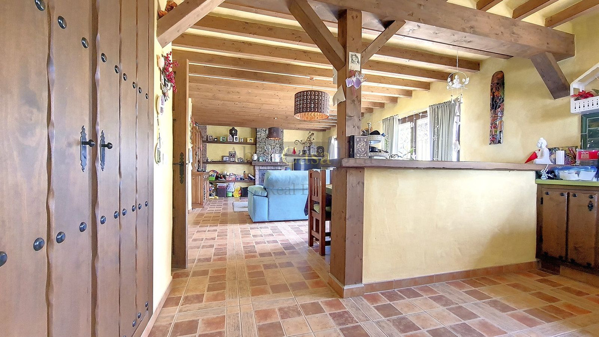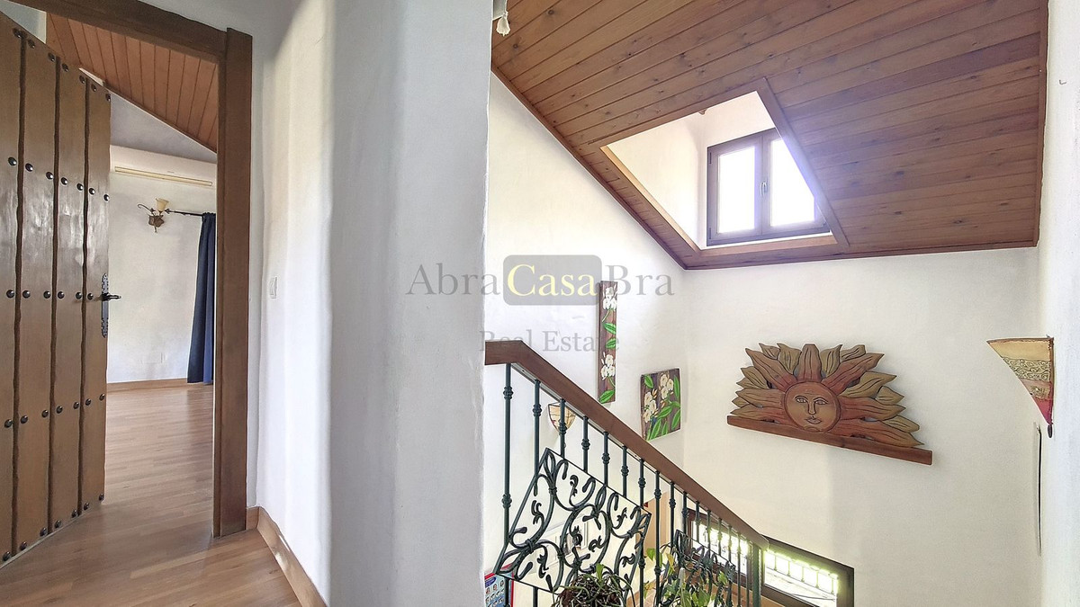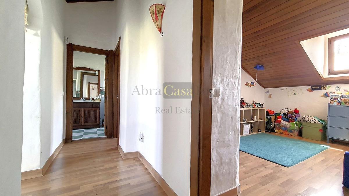 Upon entering, one immediately notices the warm and rural atmosphere. The typical Andalusian wooden doors are specially made to measure. The stylish tiled floor is of very good quality and the nice wooden beamed ceilings complete the picture. On the ground floor is a bathroom with shower and toilet. Next to it is a large storage room for the washing machine, among other things. Further down, at the end of the hallway, is a spacious bedroom currently used as a children's playroom. To the right of the hall, you enter the living/dining area with open kitchen, which is fully equipped. There is a large fireplace in this room. The glass patio doors in the middle of the room overlook the terrace at the side of the house.