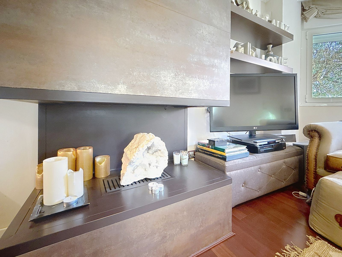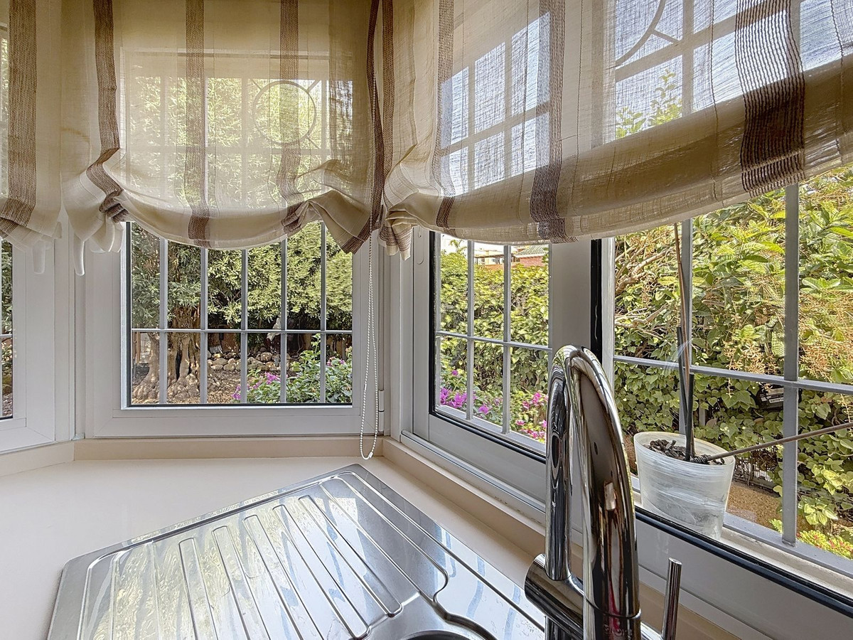 The villa welcomes you with a bright entrance hall and a separate guest toilet, before unfolding into elegant living spaces bathed in natural light. The lounge and dining area, with its inviting fireplace and graceful arched windows has views onto the beautiful gardens. The modern kitchen, finished with ceramic wood-look flooring, combines contemporary style with practical ease of maintenance.