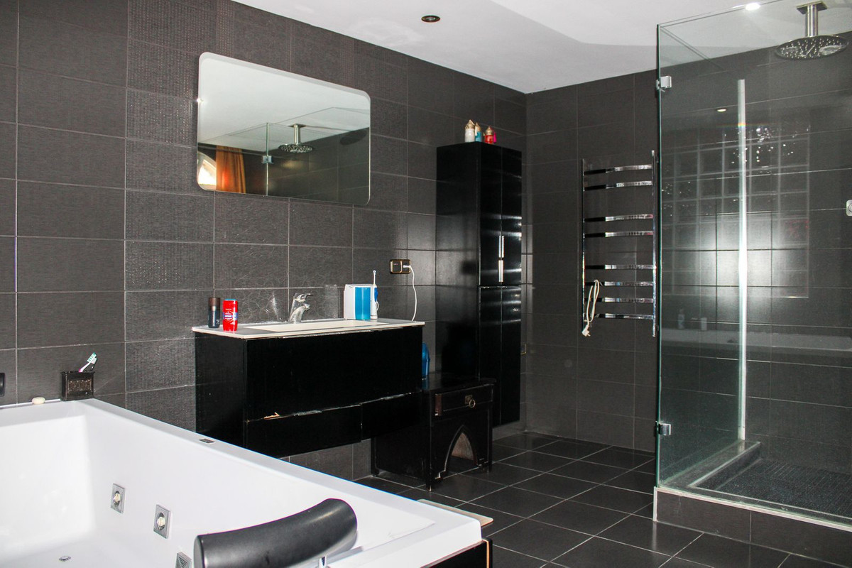 We continue down to the basement, where we find a large bedroom with jacuzzi and shower. There is also a good-sized storage room. This house must be seen, plenty of space for the large family.