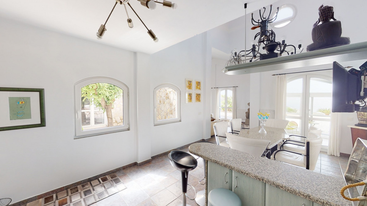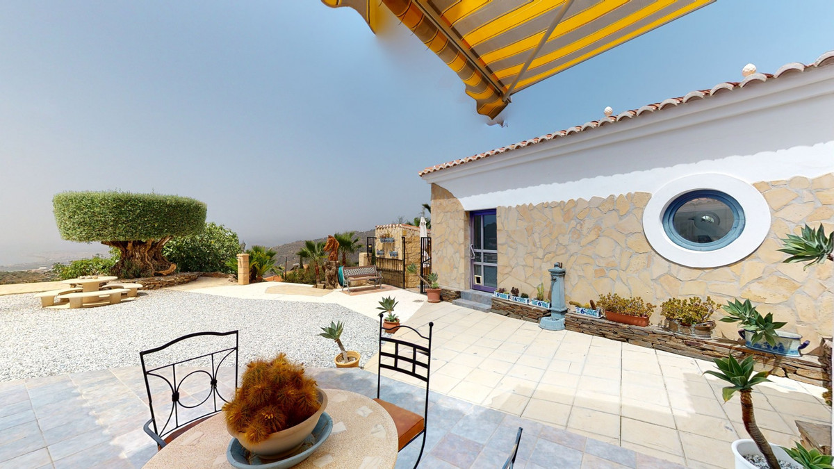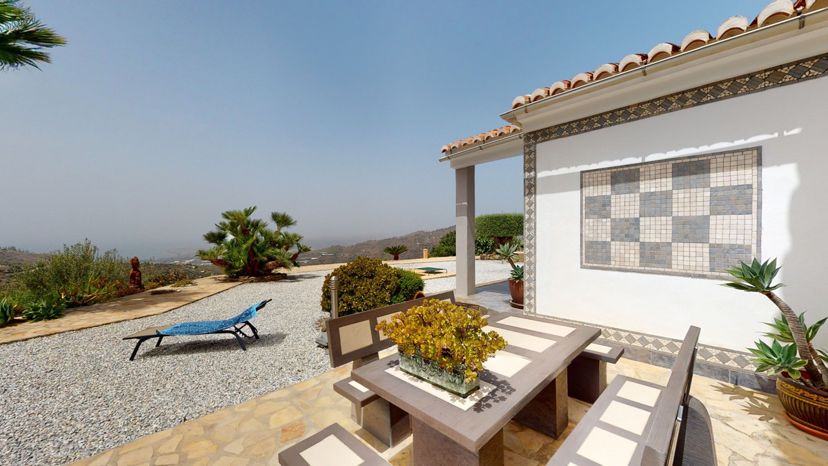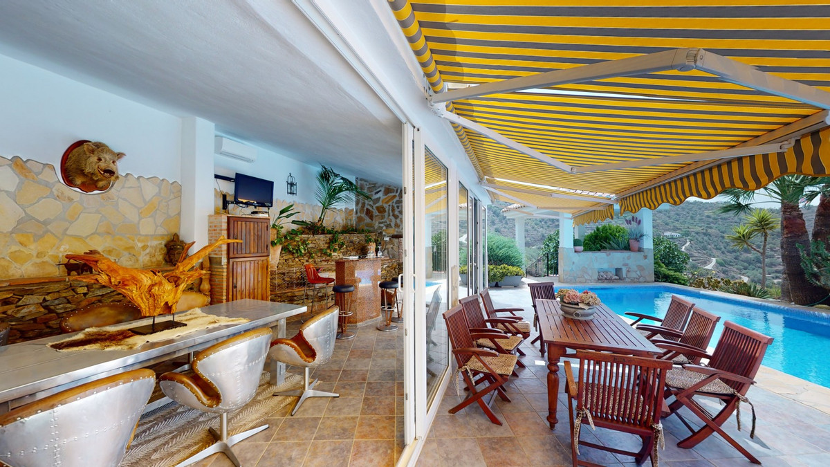 If it ́s your dream to live in a fantastic, high quality built villa with a pool and breathtaking sea views, then you have found the right property. This 280 m2 luxury villa offers everything you could possibly want. In the centre of the modern villa mixed with Andalusian style is a charming patio, which gives the house a special accent and provides beautiful lighting and atmosphere. It links the entire lower area of the property. From the entrance area, one side leads to a room used as an office, as well as a bedroom with an on-suite bathroom and the spacious living room with a fireplace and sea views. This in turn is adjacent to the dining area and the kitchen, from which you enter the hallway that is connected to the entrance area. This hallway also leads to the dressing room with an on-suite bathroom, where there is a sauna. Stairs lead from the entrance to the second floor. Here you will find the large master bedroom with an on-suite bathroom and a winter garden. External stairs lead to the outdoor area, which gives this room a separate entrance. The wonderful outdoor area offers a double garage, as well as a laundry room, which is also used for storage. Right next to the inviting pool is a gym with bathroom, as well as a glass fronted annex that serves as a lounge area with an outdoor kitchen. The perfect place for celebrations and dinners with family and friends. On the 19,500 m2 property there is also a paddock, with shelter and its own driveway, for keeping horses. It ́s located below the house. The driveway also leads to a small riding arena with three horse stalls, a tack room and a shower for the horses. You have free design possibilities of the spacious property. Whether it is to plant a fruit and vegetable garden, expand the area of horse keeping, possibly convert the riding arena to a tennis court, volleyball or small soccer field, even something completely new. The choice is entirely up to you. We are pleased to be able to present this dream property to you soon, either personally or via virtual viewing. Because this world is unique - just like our Axarquía. In Andalusia. On the Costa del Sol. Here, on the sunny side of life...