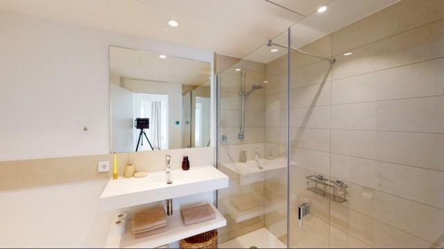 This bright ground-floor corner apartment offers 3 bedrooms and 2 bathrooms, underfloor heating throughout the entire apartment, wrapped around terraces, and an outdoor barbecue area. Two parking spaces and a storage room in the underground garage are included.