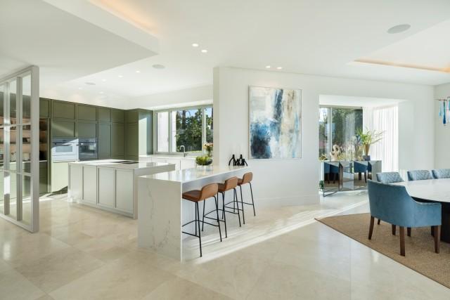 This exclusive residence in Monte Halcones (Benahavís) perfectly blends modern elegance with Andalusian charm, following a complete renovation in 2022. Spread over three floors, it offers seven spacious bedrooms, all with en-suite bathrooms, providing privacy and comfort for every family member or guest. The interiors are characterised by their brightness, thoughtful layout, and use of materials such as polished marble, warm wood, and contemporary furnishings. The expansive living and dining area seamlessly integrates with the outdoors, while the designer kitchen, equipped with Danespan appliances, guarantees both functionality and style.