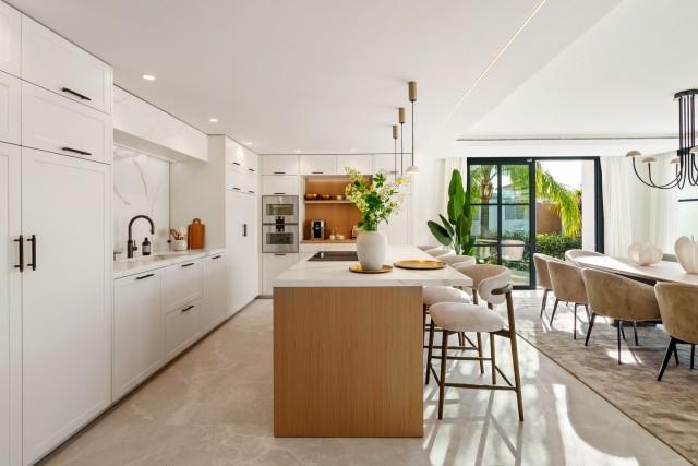 This modern Mediterranean residence in La Quinta boasts stunning sea views and a recent complete renovation. Situated on a 1,109 m² plot, it combines elegant architecture with refined interiors designed by Soledad Merchant. The main floor features a spacious open-plan living area with floor-to-ceiling windows, custom shelving, and a seamless connection to the outdoor spaces. The kitchen, one of the highlights, incorporates a large central island, integrated appliances, and designer furnishings, with direct access to the terraces and swimming pool.