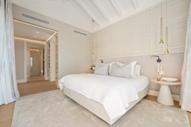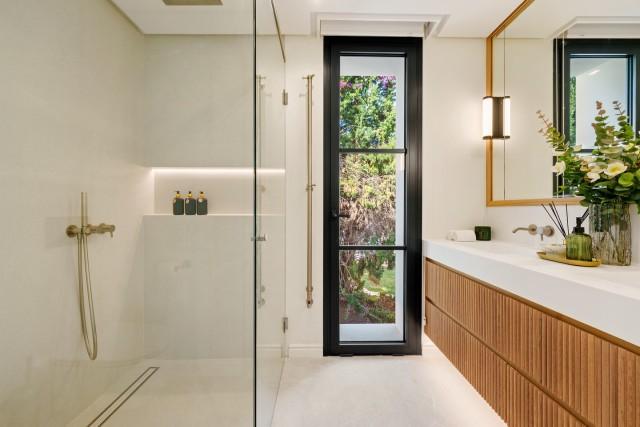 The property has five bedrooms, including a master suite on the upper floor with a private terrace and coastal views. The entertainment options elevate the lifestyle, with a recreation room, gym, sauna, and climate-controlled wine cellar. Outside, various living and dining areas are arranged around the landscaped garden and a private swimming pool. Located just minutes from golf courses, international schools, and all the amenities of Nueva Andalucía and Marbella.