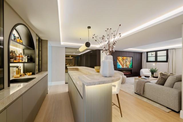 A standout feature of the home is the designer kitchen. Equipped with premium appliances and refined bespoke cabinetry, it includes a large central island perfect for cooking, gathering or entertaining. Its strategic layout provides direct visibility toward the living area and immediate outdoor access-ideal for a relaxed indoor-outdoor lifestyle.